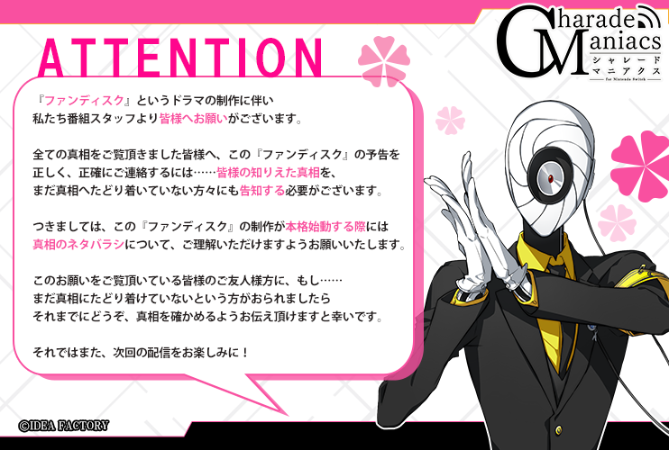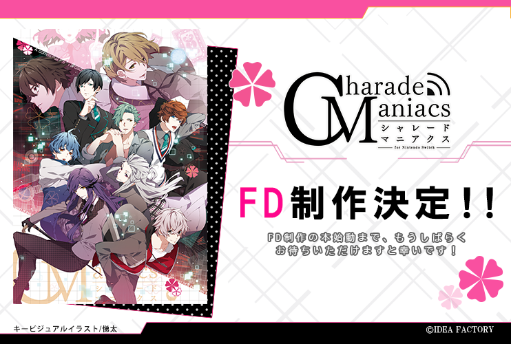 オトメイトドラマティックシアターvol.05「CharadeManiacs -Howling Deception-」夜公演内に放映された告知PVで、Nintendo Switch「CharadeManiacs」のファンディスク制作決定を発表いたしました。