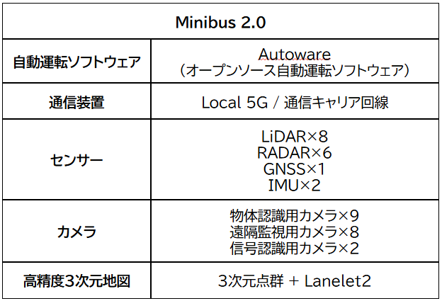ティアフォー社製 Minibus 2.0は、EVバス(定員28名、座席15席)です。ステアリングやブレーキ等の駆動系電動モジュールおよびレベル4水準の自動運転機能に対応した電気電子アーキテクチャを開発しました。センサやコンピュータ、電動化モジュールに対して単一故障による制動不良や操舵不能を防ぐための冗長化設計を行っており、保安基準に適合しています。また本実証においては、車載通信技術はローカル5Gと通信キャリア回線の冗長化に対応し、遠隔監視拠点や路側センサ統合基盤サーバと自動運転車両を接続し、遠隔監視や見通し外情報の活用に係る検証に対応します。