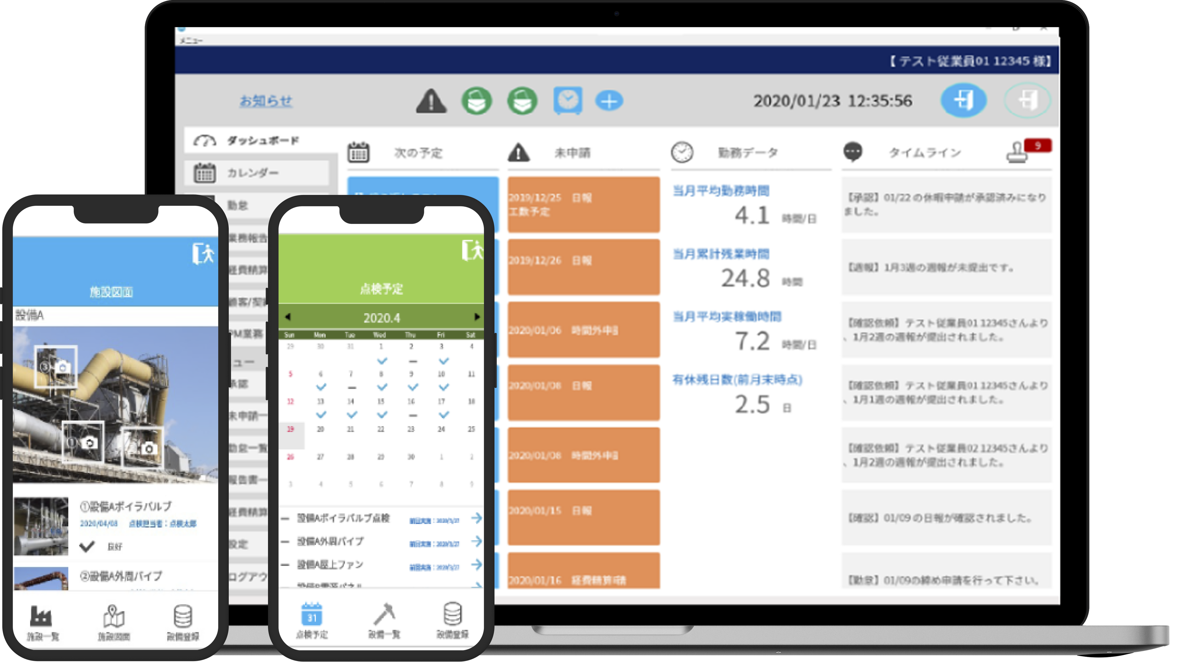 日報管理や点検記録、報告書作成など現場で使える機能を多数ラインナップ。
