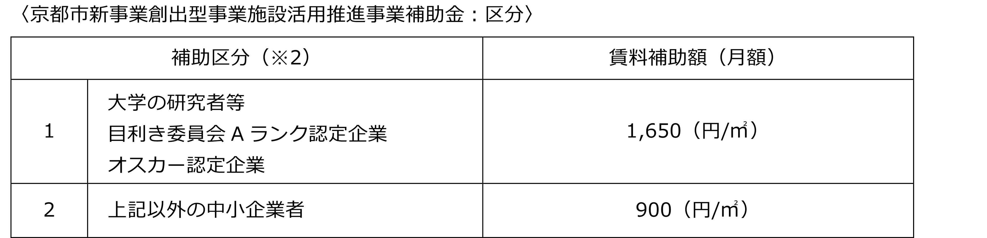 ※1 京都市賃料補助制度が適用された場合、補助金は毎年度事業完了後に交付されます。補助区分の適用・交付期間・補助額等は、『京都市新事業創出型事業施設活用推進事業補助金交付要綱』に基づき決定されます。