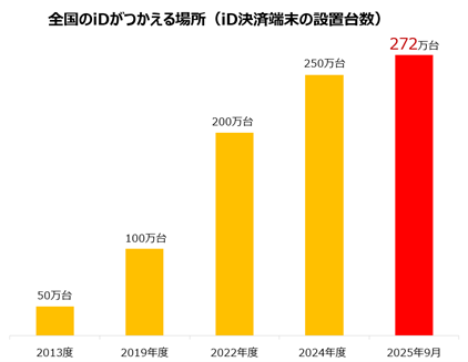 「iD」は、2005年12月1日(木)に提供を開始し、2025年12月1日(月)に20周年を迎えました。サービス開始当初は、ドコモの「おサイフケータイ」への搭載から始まり、現在ではApple PayやGoogle Pay(TM) といった多様なモバイル決済プラットフォームにも対応し、より多くのお客さまにご利用いただいています。また、「iD」決済端末の設置台数は、2025 年9月に272万台となりました。