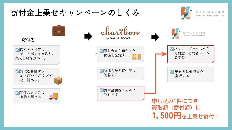本キャンペーンでは、指定の期間中にクーポンコードを利用して書籍等の寄付をお申し込みいただくと、バリューブックスによる買取相当額(寄付金)に加え、バリューブックスより1件のお申し込みにつき1,500円が上乗せされ、ほくりくみらい基金へ寄付されます。