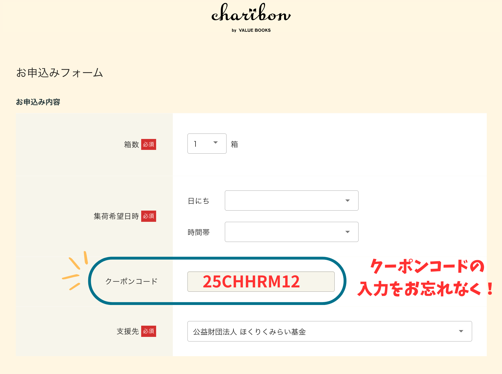 通常のチャリボンお申し込みフォームをご利用の場合は、以下のコードをご入力ください。