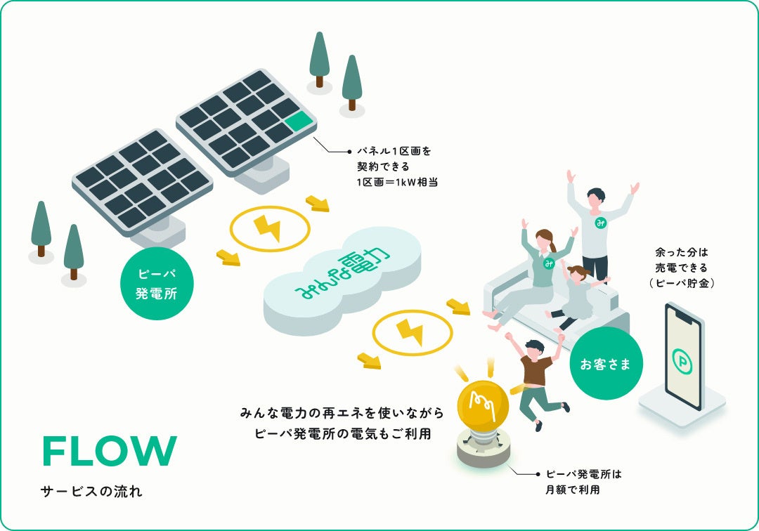 本プロジェクトは、個人が仮想的に発電所の一部を保有し、自宅でその電気を利用できるクラウド型発電サービス「ピーパ」を通じて提供されます。 ユーザーは毎月定額の料金を支払いながら、自らの「発電区画」から生まれる再エネの環境価値を享受。環境貢献を“見える化”しながら、地域電力の循環に直接参加できます。