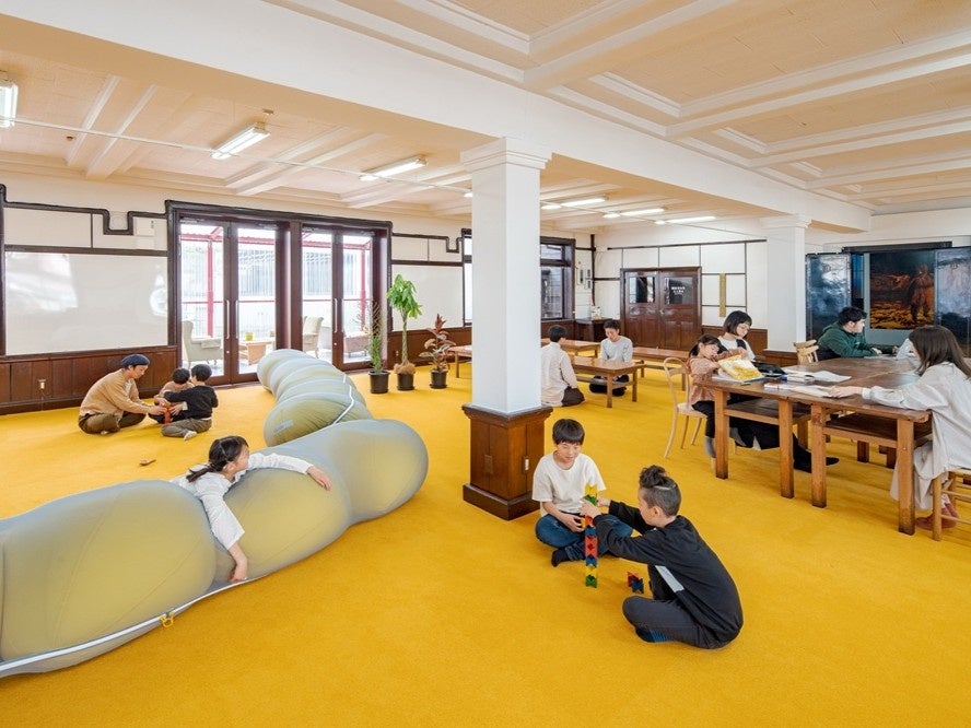 同施設には、地域の人々がおもいおもいに時間をすごせるカフェ風のテラスや子どもたちがのびのび遊べる共用スペース、そしてビジネスの起点として機能するシェアオフィスやレンタルオフィスが設けられています。