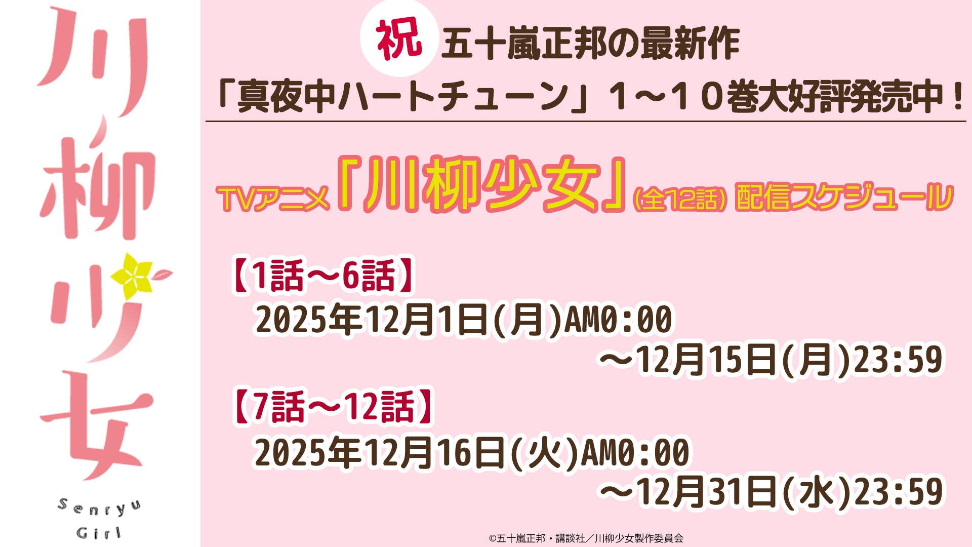 累計100万部突破の人気マンガ「川柳少女」などで知られる、五十嵐正邦先生による最新作「真夜中ハートチューン」第11巻が12月17日より発売!これを記念して、講談社が運営するYouTubeチャンネル「フル☆アニメTV」にて、TVアニメ「川柳少女」全12話を順次無料配信いたします。【第1話~第6話】を本日12月1日から12月15日まで、【第7話~第12話】を12月16日から12月31日までの期間限定配信となりますので、最新作「真夜中ハートチューン」と一緒にぜひお楽しみください!