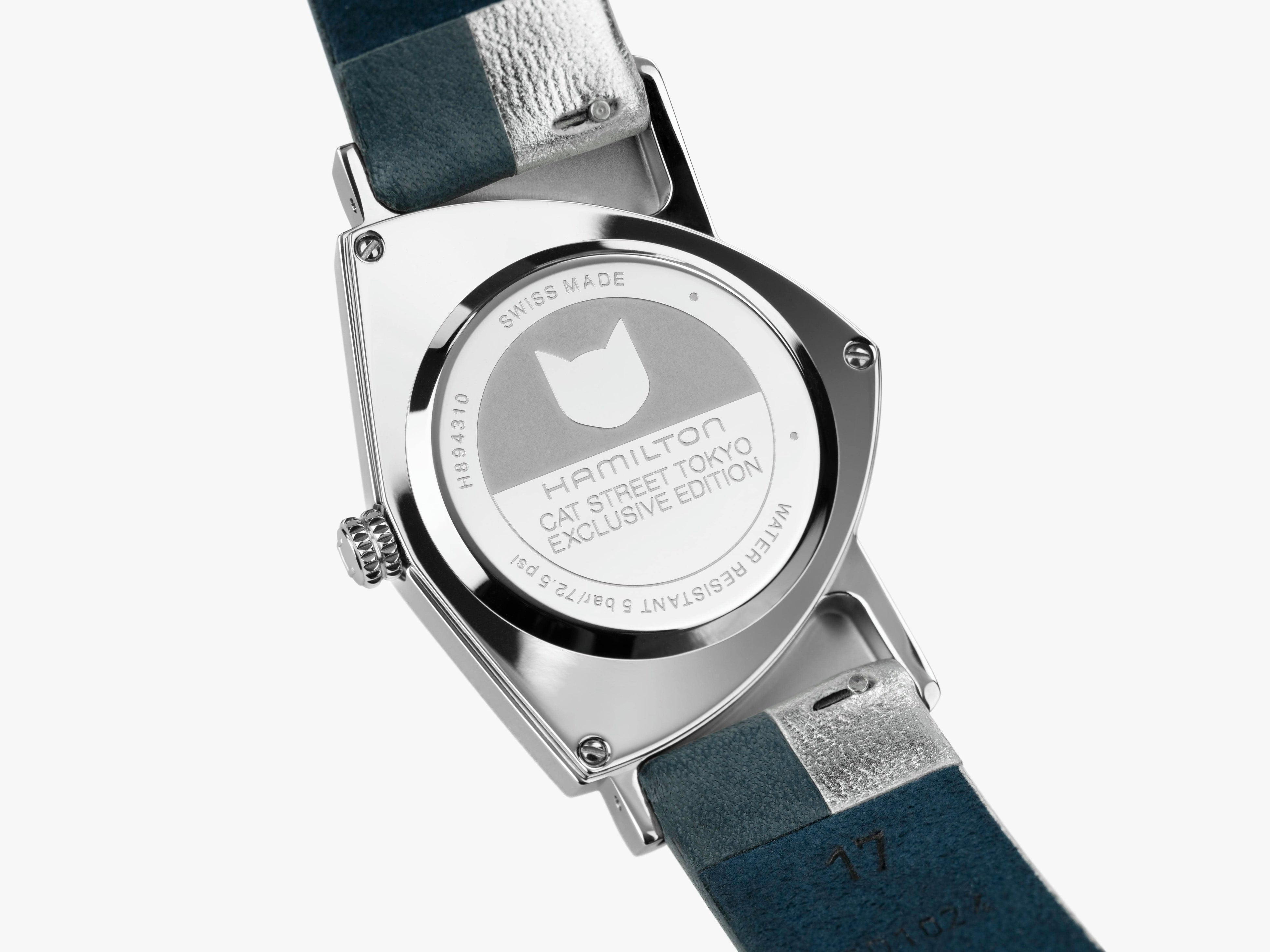 イージークリックシステムが搭載されたこのモデルには、フレックスブレスレットが付属しており、気分やシーンに応じてストラップを簡単に交換できます。これは、エルヴィス・プレスリーが愛した「ベンチュラ」の精神を現代に引き継ぎ、エルヴィスへの敬意を示した、日本独自の解釈でもあります。 ケースバックには、キャットストリートの名にふさわしく、“猫”を模した特別なデザインを施しました。