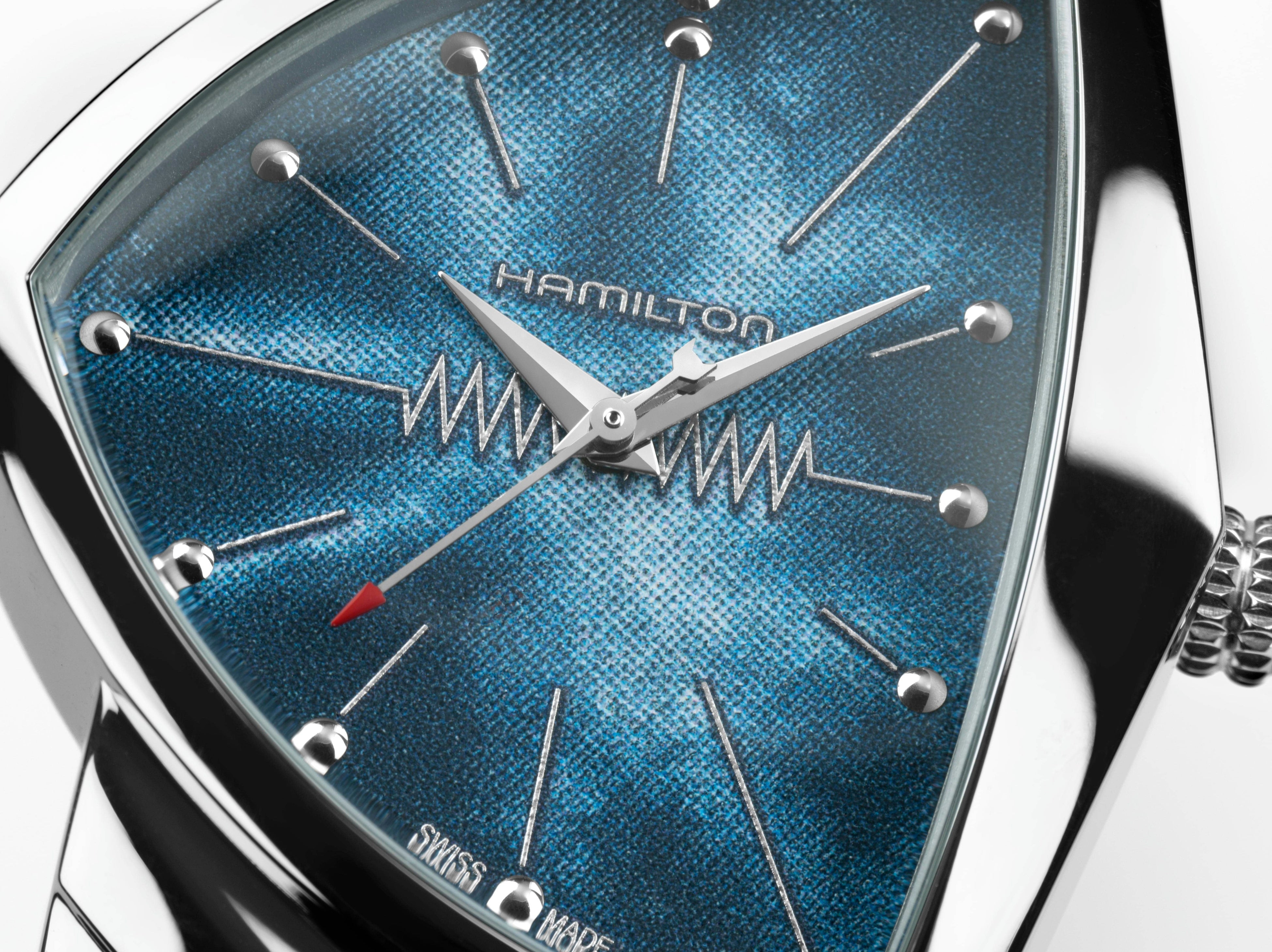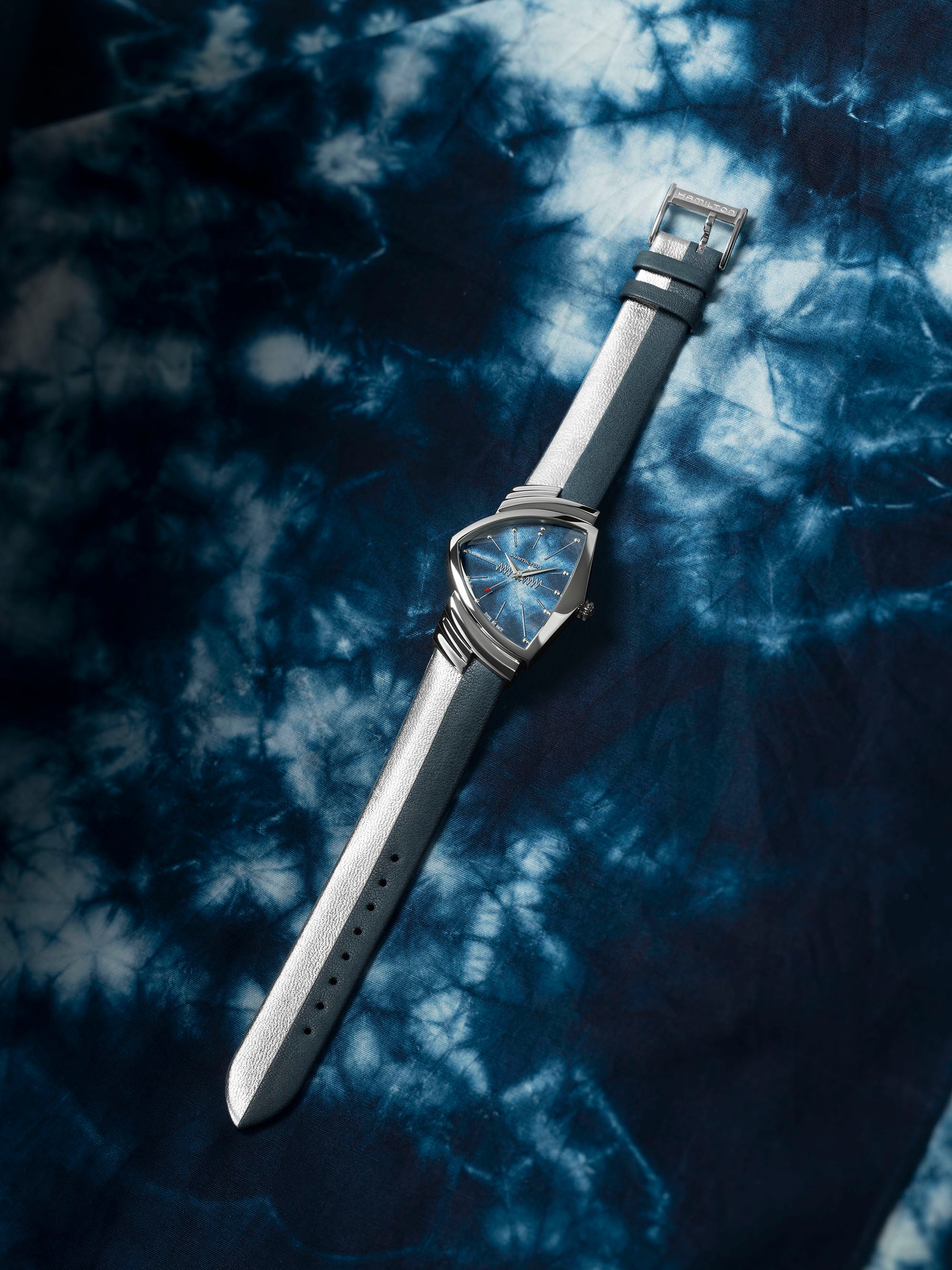 このプロジェクトのスタートは、ハミルトンの日本チームが、絞り染めの専門家たちと連携し、様々な手法で仕上げられた藍染の布を選定したところから始まりました。それらの布の高解像度写真をもとに、ハミルトンのデザイナーが複数のダイヤル案を制作しました。幾度となく開発チームと日本チームの協議が交わされ最終的に選ばれたデザインは、規則性と偶然が共存する絞り染めの美しさが最大限に引き出され、見る者に深い印象を与えるものとなりました。