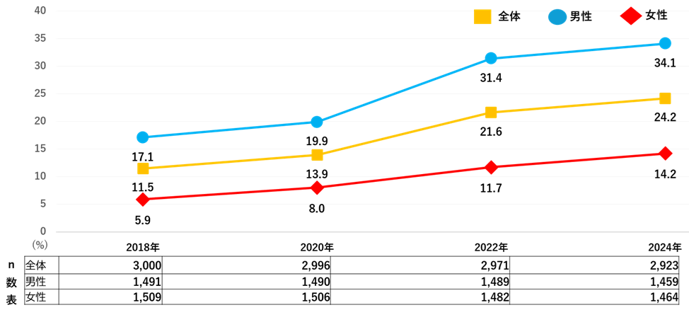 2024年のインターネットによるスポーツ観戦率は全体の24.2%であった。2022年の21.6%から2.6ポイント増加し、調査を開始した2018年から上昇が続く。性別にみると、男性34.1%、女性14.2%であり、男性が女性より19.9ポイント高い。男性の観戦率は女性より高い水準で推移し、直接観戦やテレビ観戦と比べて大きな差がみられた。図3. インターネットによるスポーツ観戦率の年次推移(2018~2024年):全体・性別