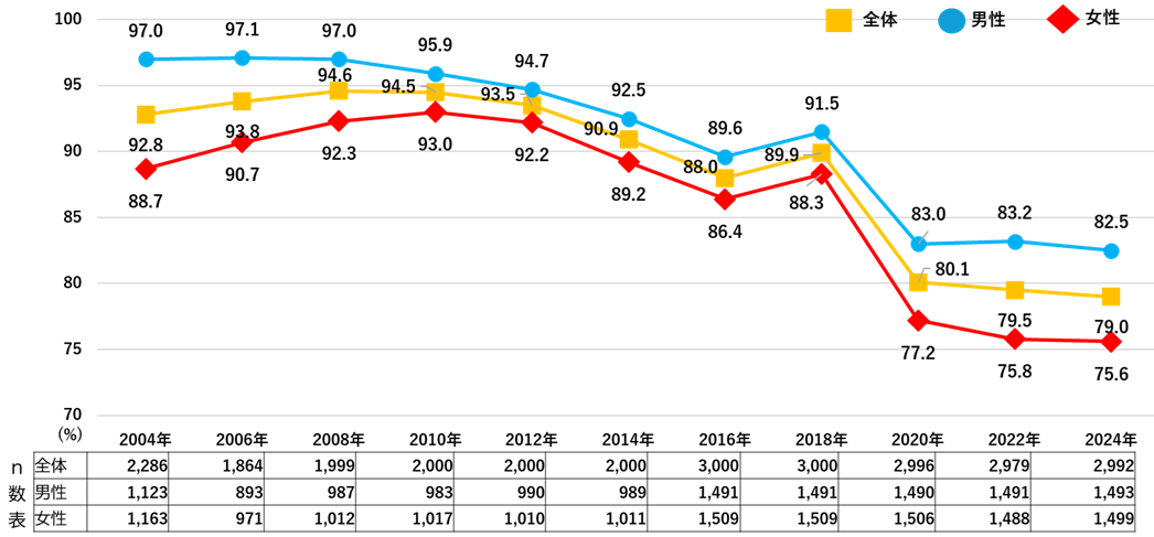 2024年のテレビによるスポーツ観戦率は79.0%と、これまでの調査で最も低かった。観戦率は2004年以降90%前後で推移してきたが、2018年から2020年にかけて9.8ポイント減と大きく低下し、以降は横ばいで推移している。性別にみると、男性82.5%、女性75.6%で、男性が女性より6.9ポイント高い。調査開始以来一貫して、男性の観戦率は女性を上回っている。図2. テレビによるスポーツ観戦率の年次推移(2004~2024年):全体・性別