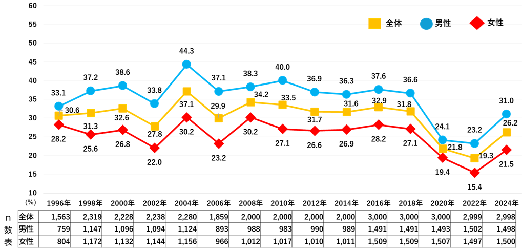笹川スポーツ財団「スポーツライフに関する調査」(1996~2024)より作成 注) 2014年までは20歳以上、2016年以降は18歳以上を調査対象としている