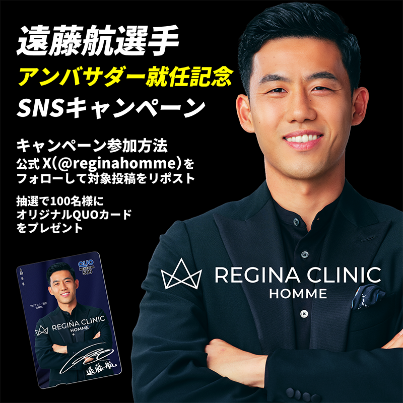レジーナクリニックオムは、医療脱毛を「美のため」ではなく、“誠実の身だしなみ”として捉えるブランドコンセプトを掲げています。清潔とは単なる見た目の問題ではなく、人から信頼されるための礼儀であり、姿勢そのものだと考えています。この価値観は、常に誠実に向き合い続け、日々の積み重ねを大切にしてきた遠藤選手の姿と重なります。遠藤選手は、確かな実力に加え、周囲の仲間から厚い信頼を寄せられる人柄を備えた、“誠実の象徴”ともいえる存在です。その姿は、レジーナクリニックオムが掲げる「誠実さこそが、信頼される男の新しい身だしなみである」というメッセージを体現しています。