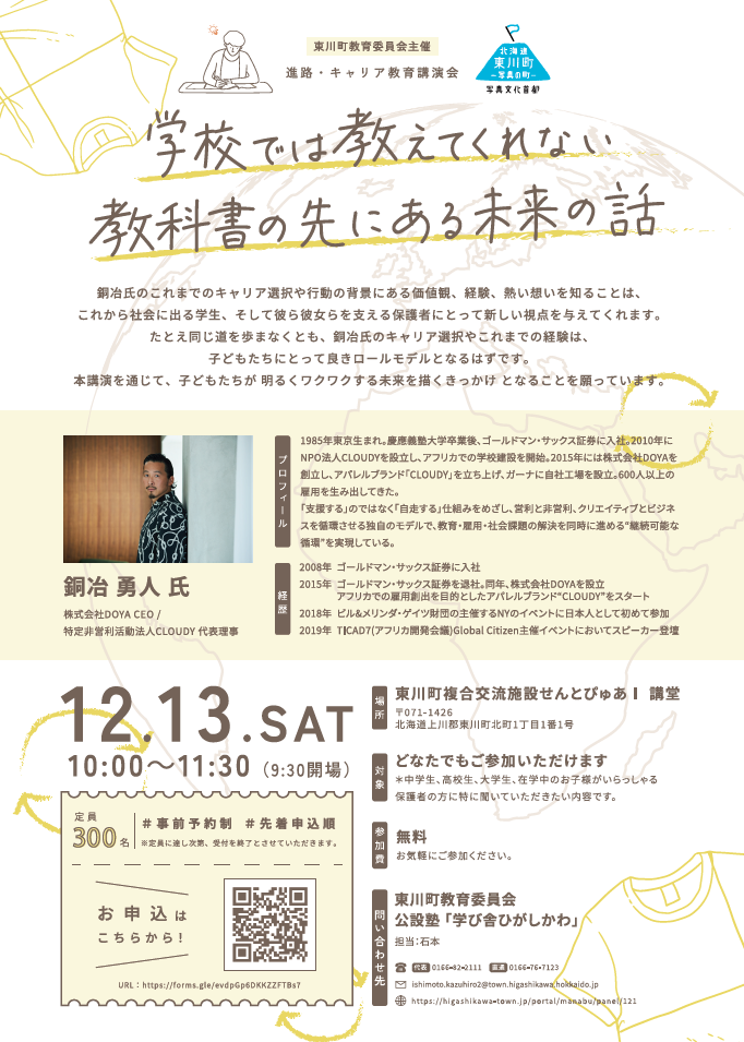 東川町教育委員会 学校教育課 公設塾「学び舎ひがしかわ」は、2025年12月13日(土)に中高生のための進路・キャリア教育講演会「学校では教えてくれない、教科書の先にある未来の話」を開催いたします。ゲストスピーカーは株式会社DOYA CEO/特定非営利活動法人 CLOUDY代表理事の銅冶勇人氏です。営利と非営利、クリエイティブとビジネスを循環させる独自のモデルと銅冶氏のこれまでの進路・キャリア選択の背景にある価値観や経験、熱い想いを知ることは、これから社会に出る学生、そして彼ら彼女らを支える保護者にとって新しい視点を与えてくれます。
