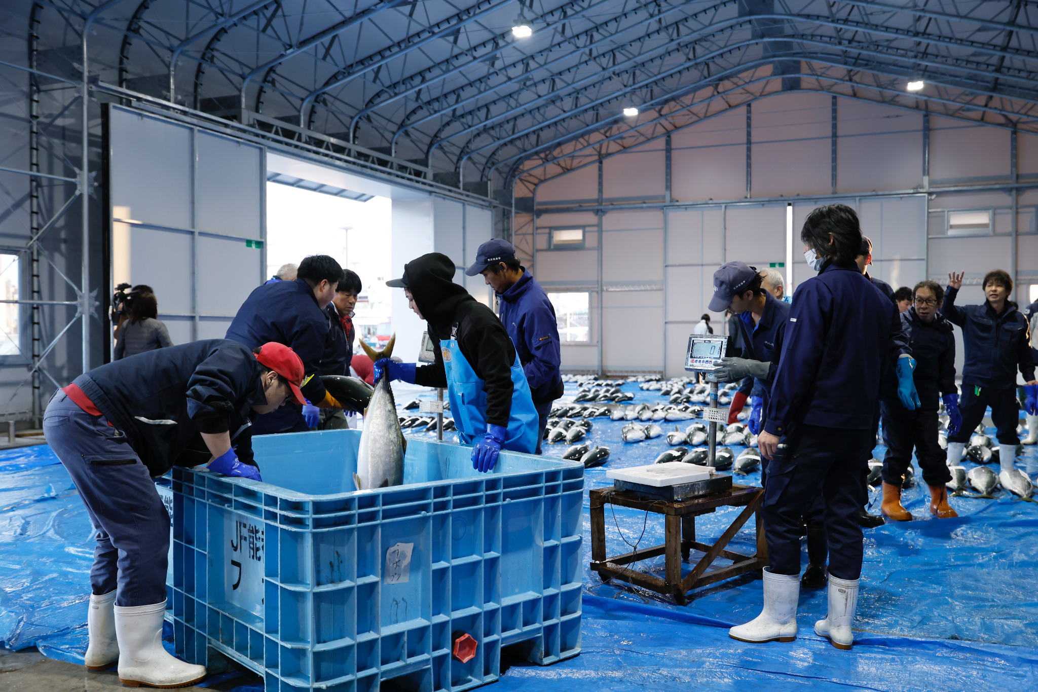 「鰤-1グランプリ」には、事前エントリー21本のうち、当日の選抜を経た 9本 が会場に揃いました。重量14kg以上、傷があまりない、資源管理への取り組み等の極めて厳しい基準に加え、市場の目利き人による審査を経て、1本 が「煌」の栄冠を勝ち取りました 。