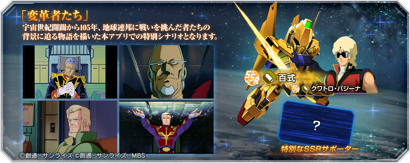 「変革者たち」をクリアすると、SSRユニット「百式」やSSRキャラクター「クワトロ・バジーナ」、そして公開が予定されている「機動戦士ガンダム 閃光のハサウェイ キルケーの魔女」を記念した特別なサポーターが報酬として獲得できます。