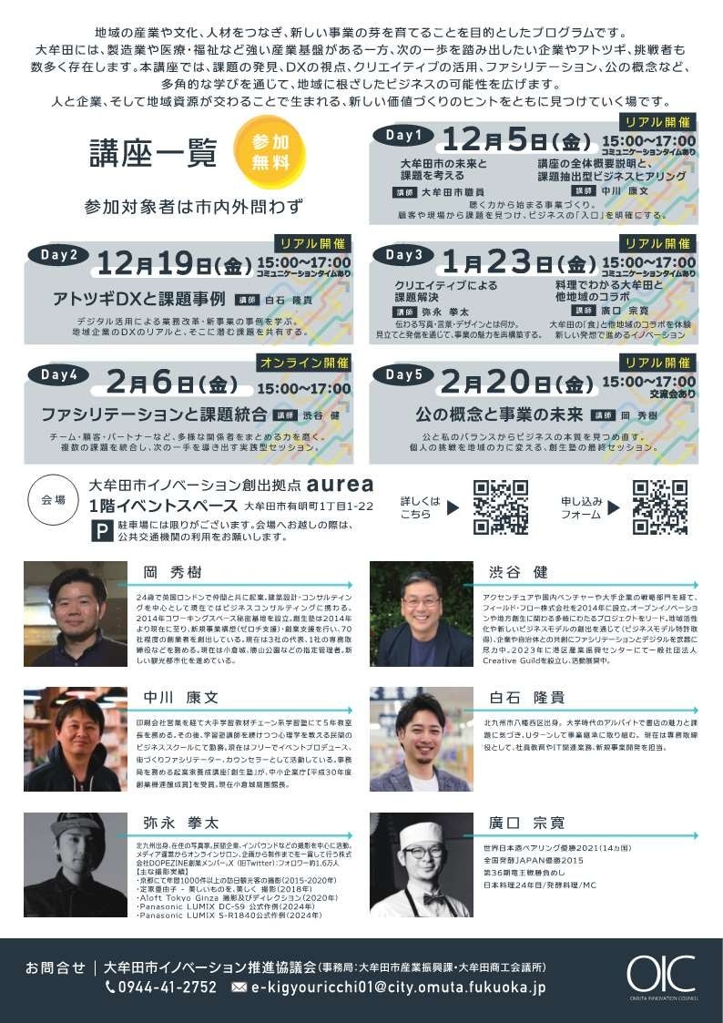 大牟田には、製造業や医療・福祉など強い産業基盤がある一方、次の一歩を踏み出したい企業やアトツギ、挑戦者も数多く存在します。本講座では、課題の発見、DXの視点、クリエイティブの活用、ファシリテーション、公の概念など、多角的な学びを通じて、地域に根ざしたビジネスの可能性を広げます。
