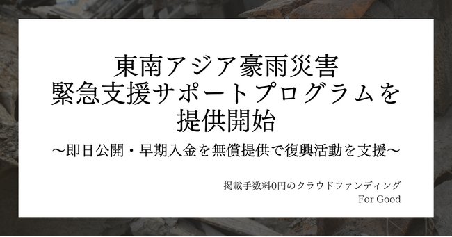 東南アジア各地での豪雨災害の発生を受け、掲載手数料0円のクラウドファンディングFor Goodが緊急支援サポートプログラムを提供開始