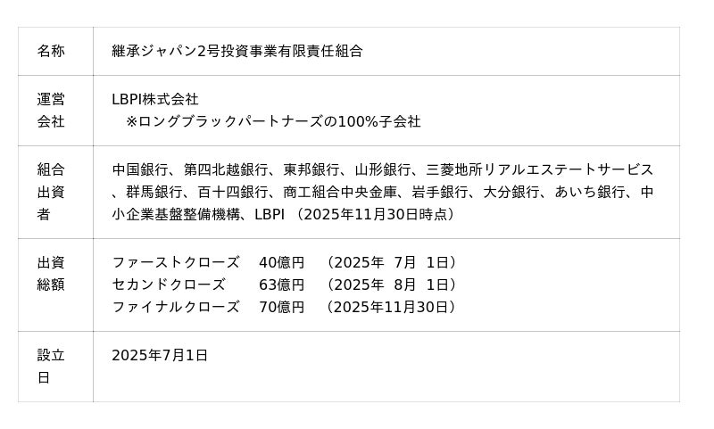 ロングブラックパートナーズ株式会社は、投資子会社であるLBPI株式会社(代表取締役 町田一郎・牛越直)を通じて、地域中小企業の事業承継および成長戦略を支援する「継承ジャパン2号投資事業有限責任組合(以下、「本ファンド」)のファイナルクローズを完了したことをお知らせいたします。