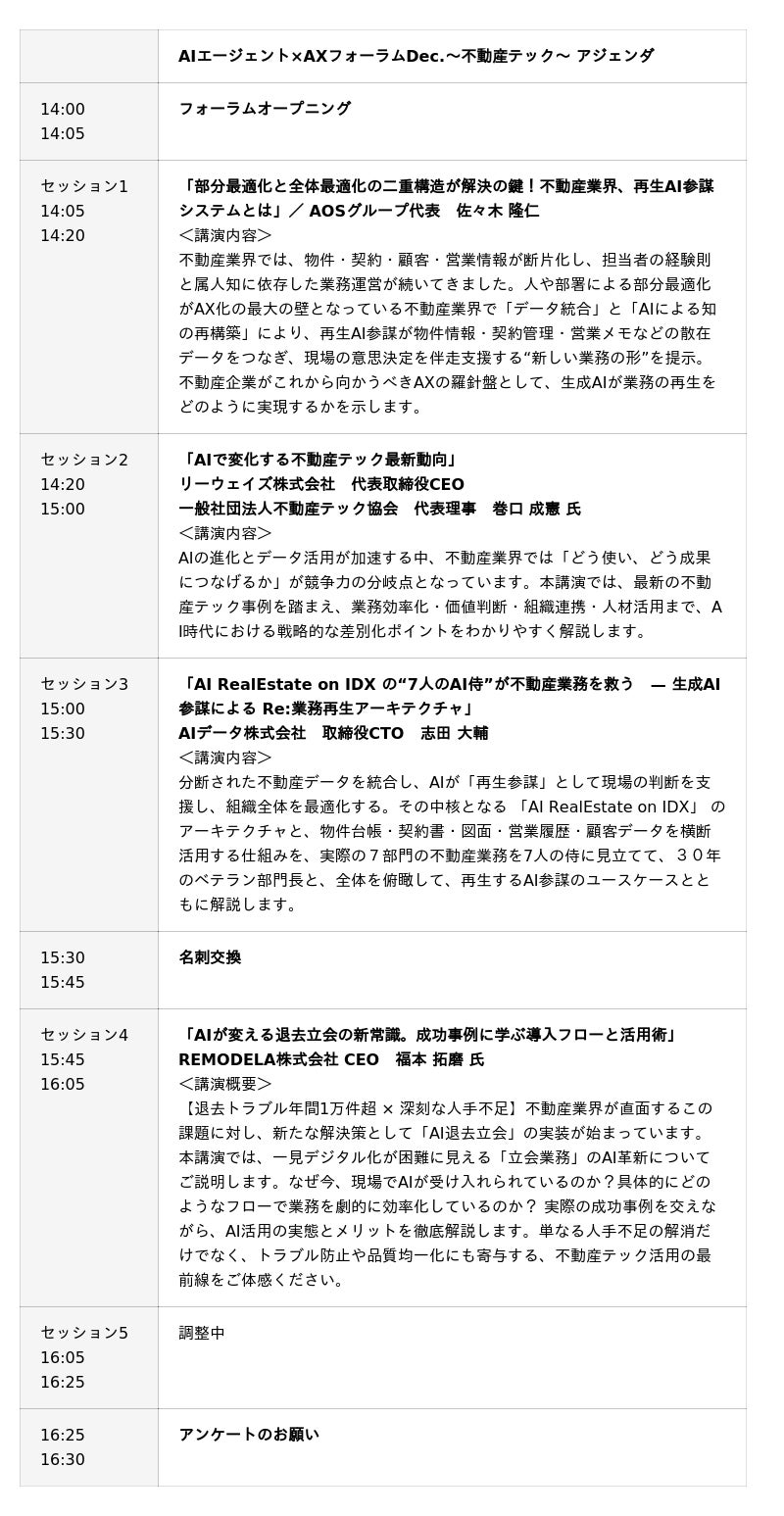 企業データとAIの利活用カンパニー、AIデータ株式会社(本社:東京都港区、代表取締役社長 佐々木隆仁。以下AIデータ社)は、12月11日に不動産業界におけるAI活用とDX推進をテーマにした「AIエージェント×AXフォーラムDec. ~不動産テック~」 を大手町の日経カンファレンスルームにて開催いたします。