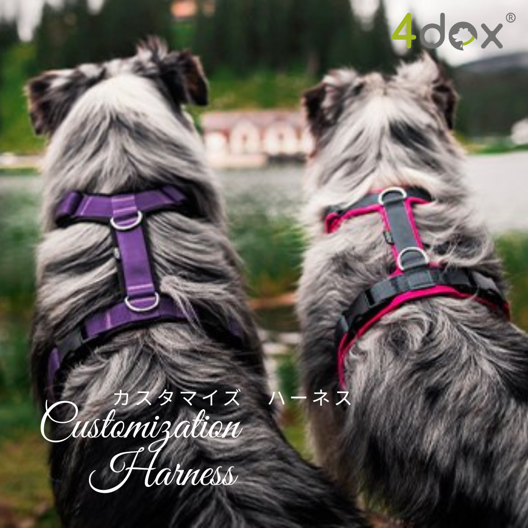 4doxのカスタムメイドハーネスは、名前入り・豊富なカラー・柔らかなクッションパッドで、愛犬に最適なオーダーメイド仕様が可能です。