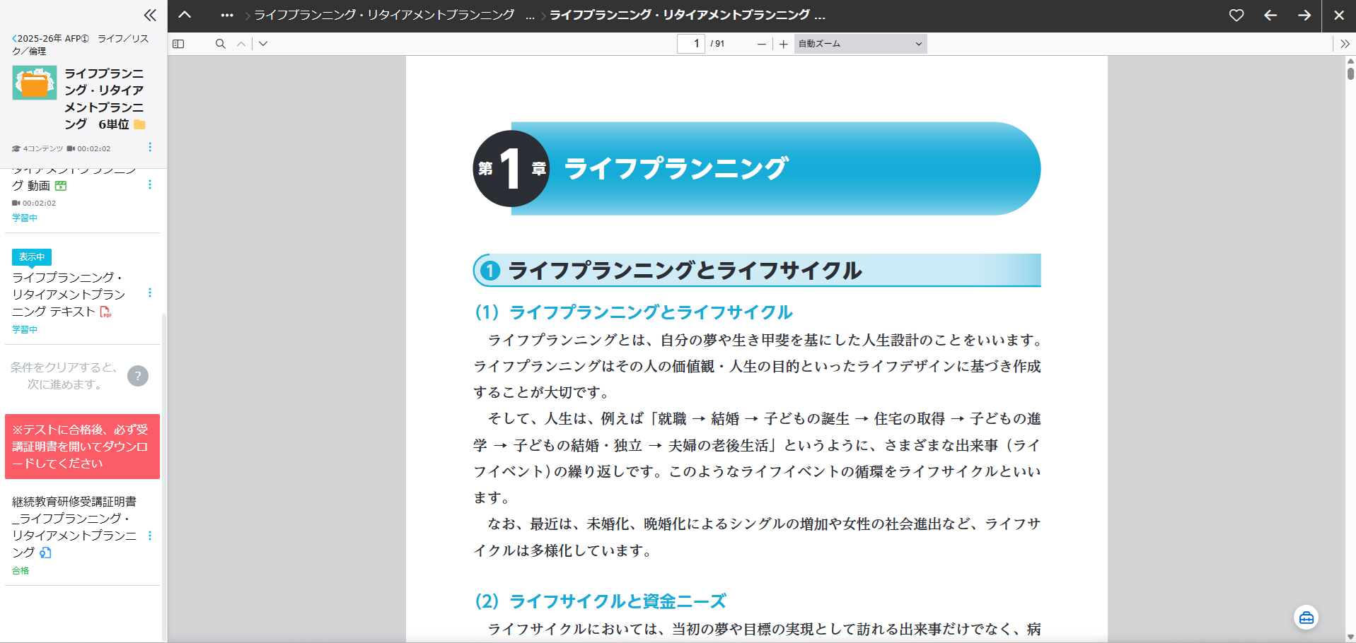 本e-ラーニングは日本FP協会の学習ガイドに準拠した内容で、講座を受講し確認テストに合格すれば、AFP/CFP(R)継続教育単位を取得することができます。