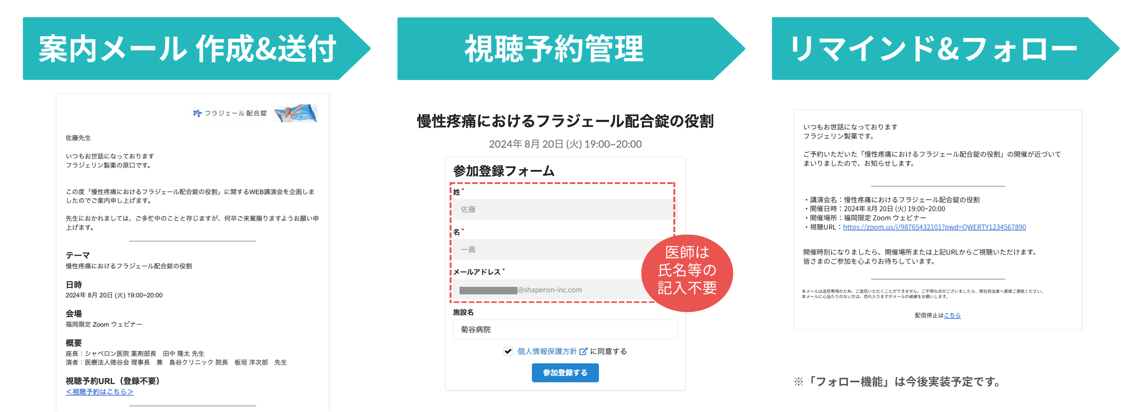 - メールで簡単にフォロー参加有無をリアルタイムに把握でき、数クリックでフォローメールを配信可能。講演会の温度感を逃さず、面談依頼などのアクションに繋げる。