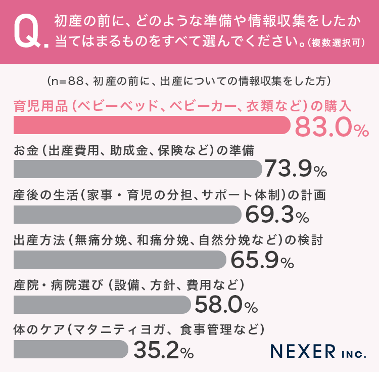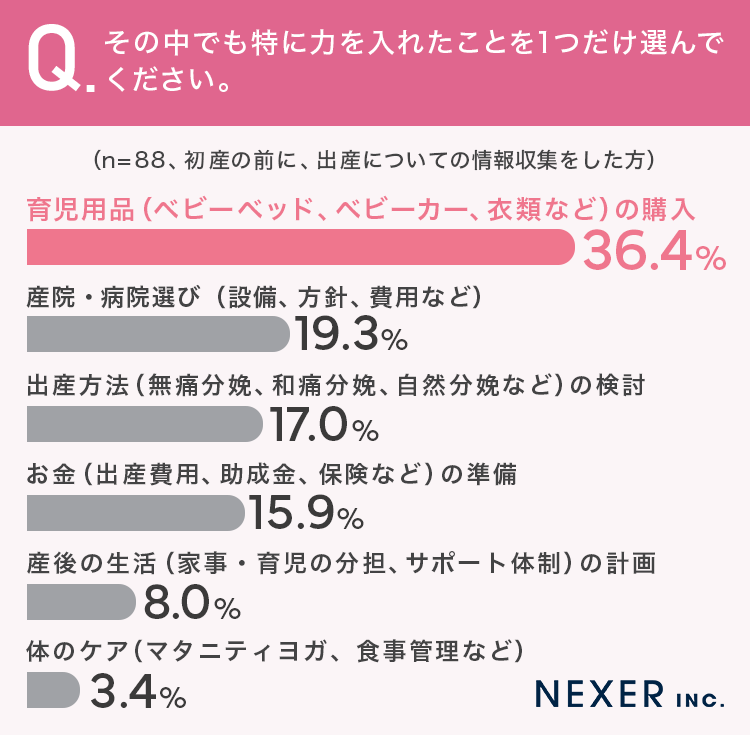 一方で「出産方法の検討」や「産院・病院選び」といった、出産に関わる情報収集も高い割合を占めており、物理的な準備と並行して、出産環境と方針の検討も重視されている事が分かりました。