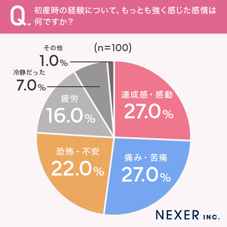出産時の感情は「達成感・感動」と「痛み・苦痛」が同率27%と二つに分かれ、事前の準備だけでは肉体的・精神的な負荷を完全には解消できない実態が浮き彫りになりました。