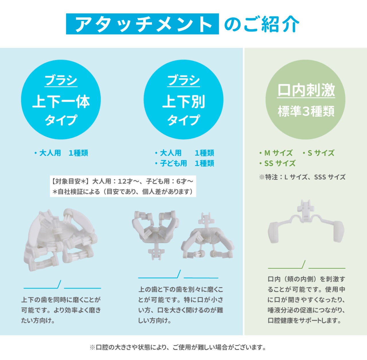 忙しいビジネスパーソンから、歯ブラシ操作が難しい小児・高齢者、身体的制約のある方まで、幅広いユーザーに活用されています。また、口腔内の発達を支援するオプションパーツもご用意しています。