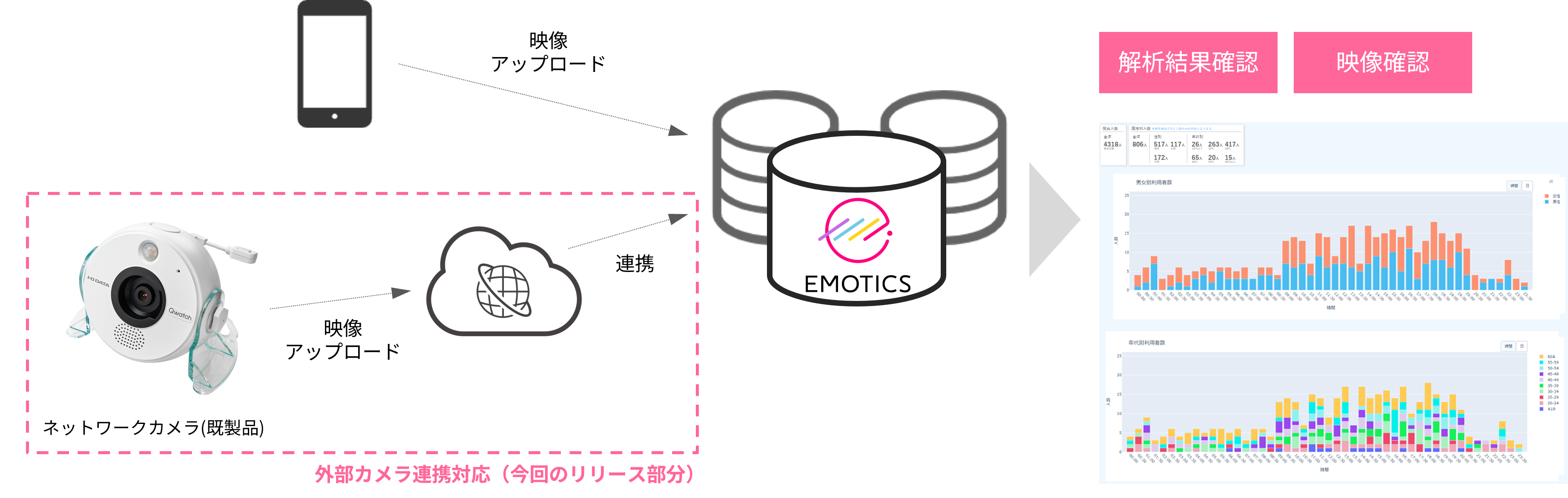 これにより、従来の「スマホだけで利用できる手軽さ」を保ちながら、常設カメラによる継続的な店舗DX・防犯用途にも対応でき、より多様なシーンで『EMOTICS』をご活用いただけるようになりました。