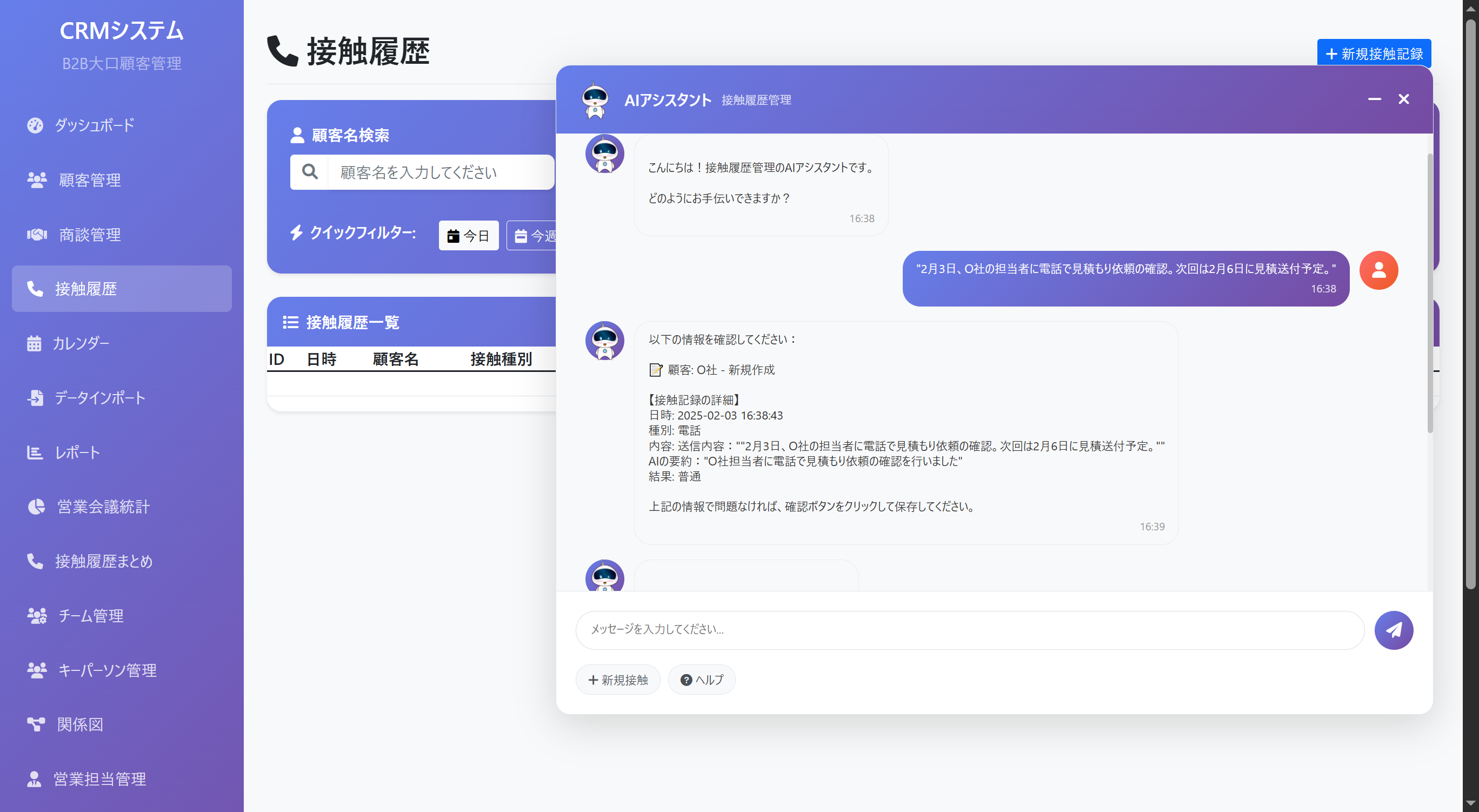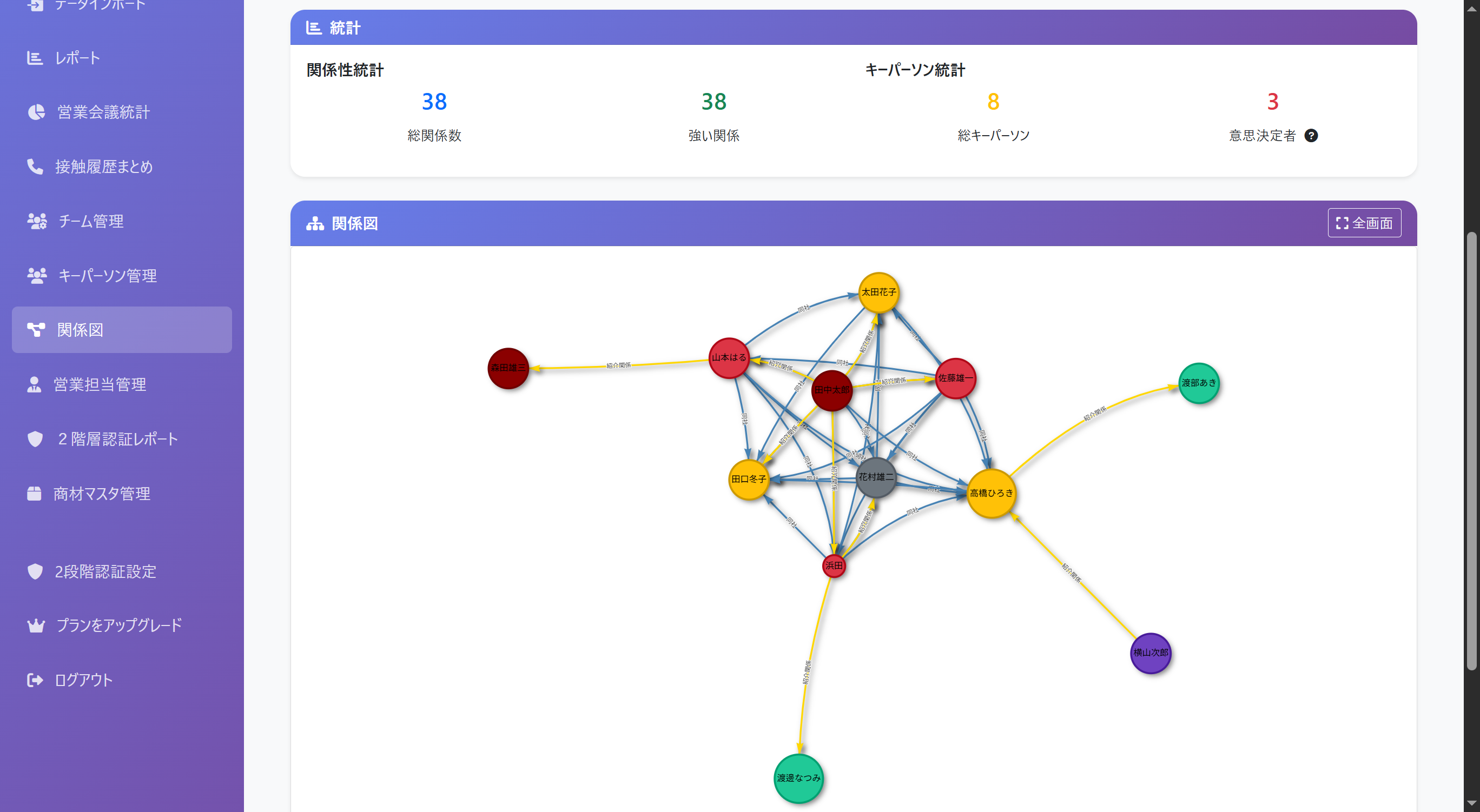 → 接触頻度分析、接触方法別統計、会議効果測定、ROI分析