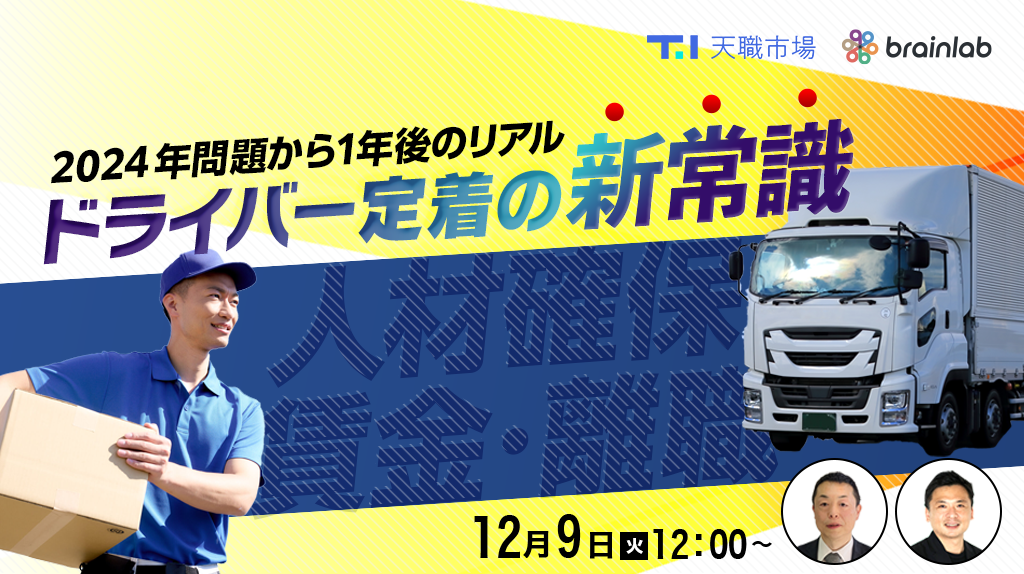 「働く」に関する社会課題をビジネスで解決するキャムコムグループの株式会社天職市場(以下天職市場、本社:東京都新宿区、代表取締役:春名敬太)と、株式会社ブレイン・ラボ(本社:東京都港区、代表取締役社長:中江典博)は、2025年12月9日(火) 12:00よりオンラインセミナー「【物流・運送業界向け】2024年問題から1年後のリアルと、ドライバー定着の新常識」を共同開催いたします。