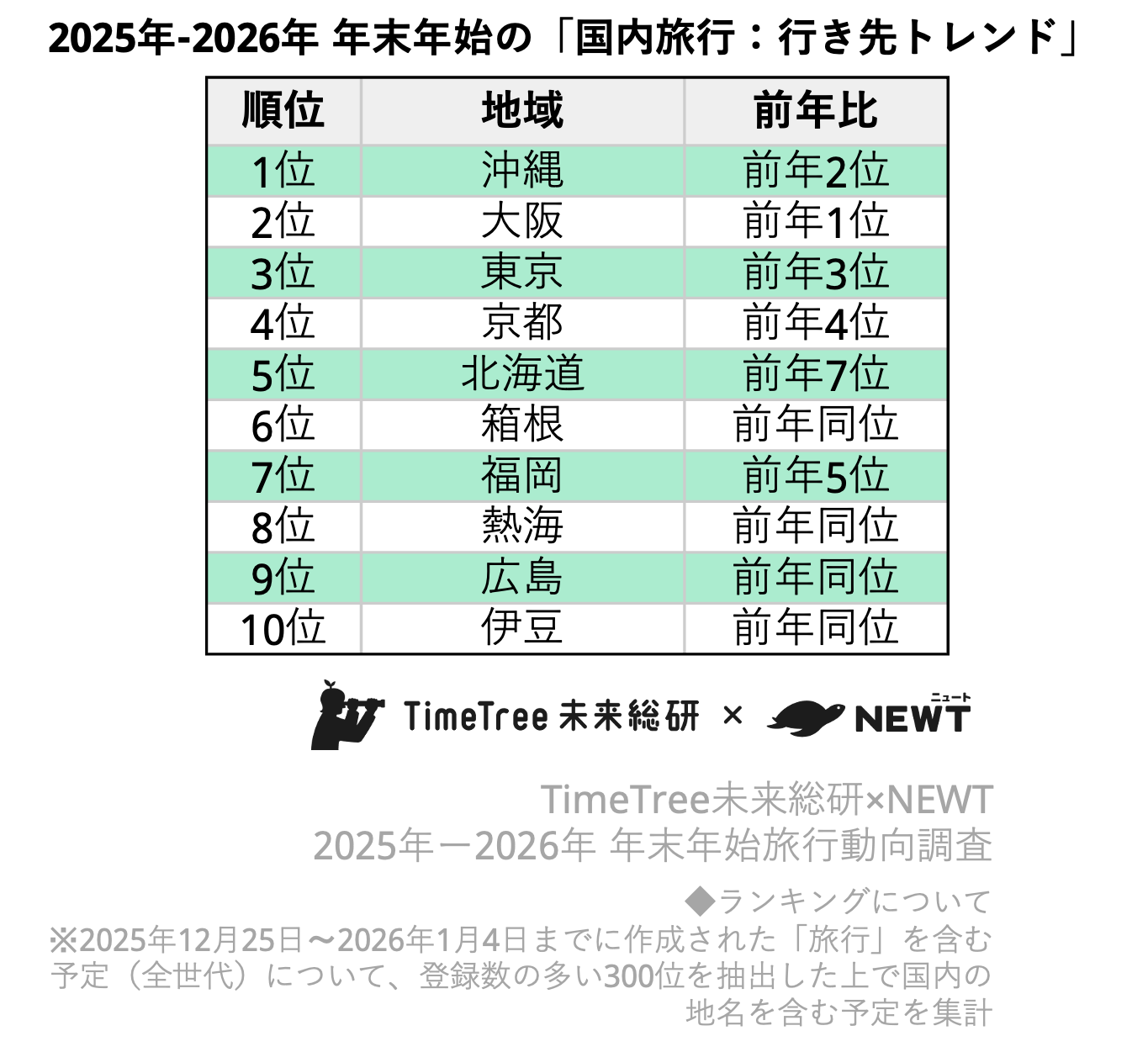 株式会社TimeTree(本社:東京都新宿区、代表取締役社長:深川 泰斗)の社内研究所『TimeTree未来総合研究所』(https://timetreeapp.com/intl/ja/future-research-institute)と株式会社令和トラベル(本社:東京都渋谷区、代表取締役:篠塚 孝哉)が運営する、かしこい、おトク、旅行アプリ『NEWT(ニュート)』は、共同で2025年~2026年・年末年始の旅行動向を分析しました。TimeTree未来総研は、年末年始(2025年12月25日~2026年1月4日)に登録された「旅行」を含む予定データを分析し、旅行アプリ『NEWT』は同アプリにおける予約データを解析しました。