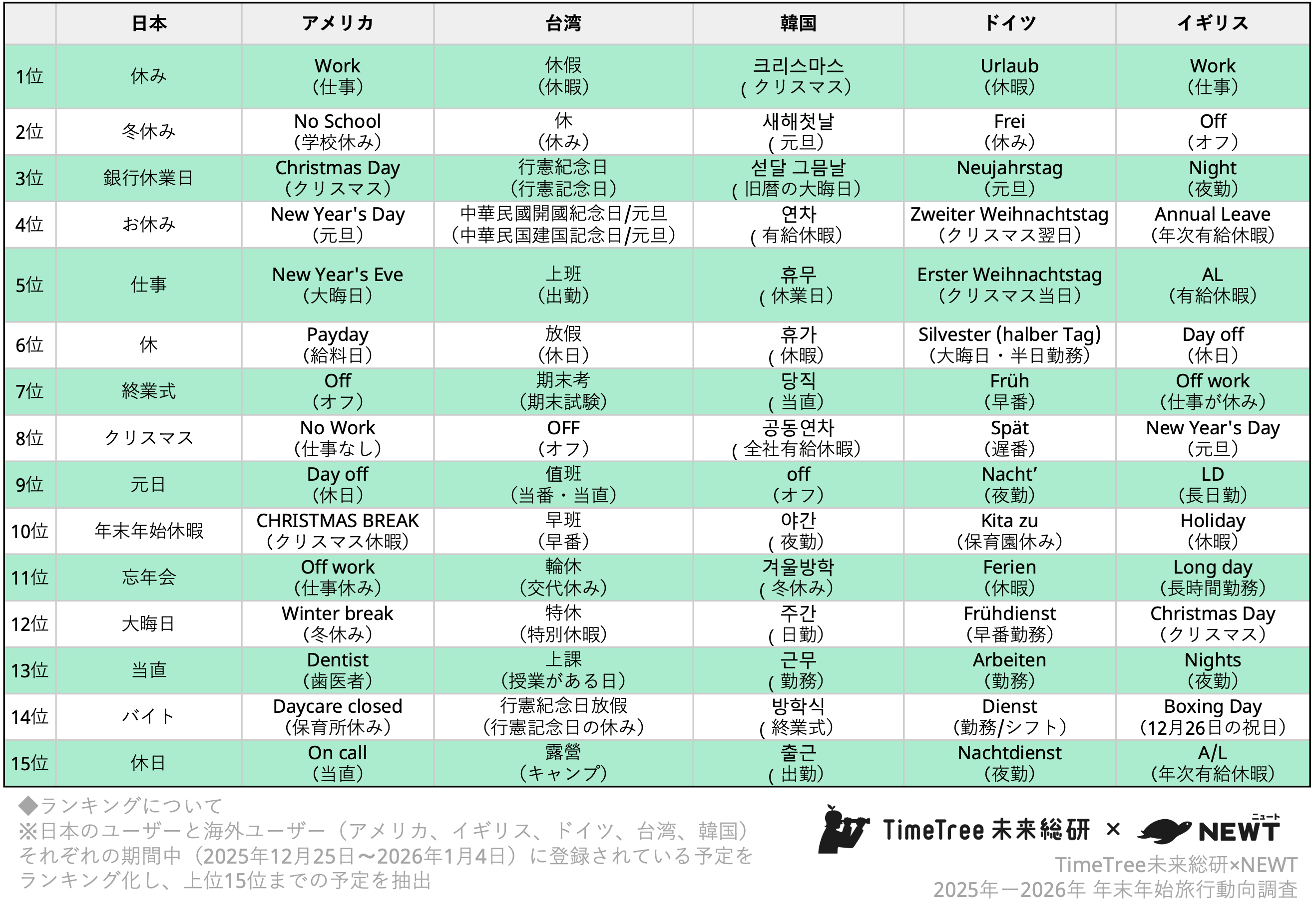 一方、アメリカとイギリスでは「Work(仕事)」が1位となり、年末年始も通常営業を継続する社会が反映されています。興味深いことに、イギリスでは「Boxing Day(12月26日の祝日)」、ドイツでは「Zweiter Weihnachtstag(クリスマス翌日)」が上位に入っており、両国ではクリスマスの翌日も祝日として定着している文化の違いも見られます。