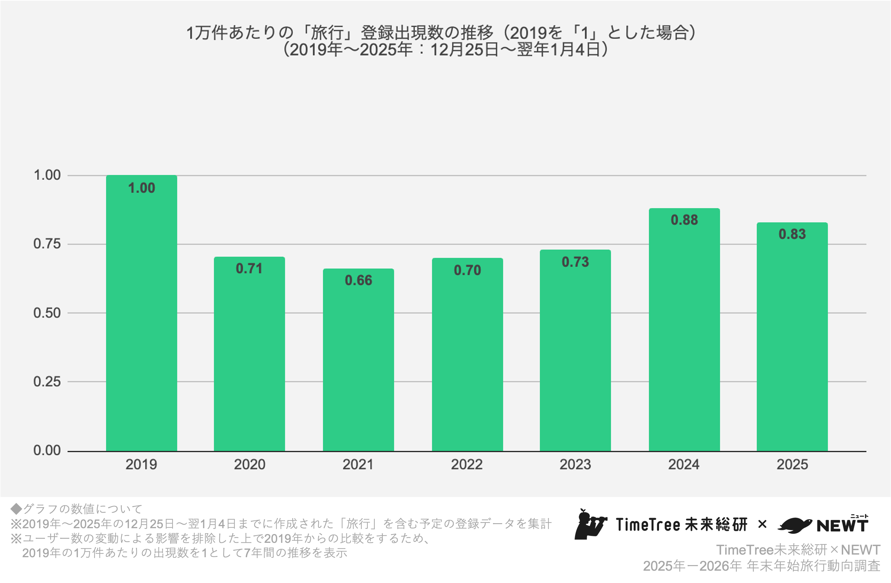 TimeTreeに登録された予定データから、2019年以降7年間における年末年始(12月25日~翌年1月4日)の「旅行」予定の推移を分析した結果、2025年の年末年始の旅行予定登録数は2019年比で83%となりました。一時期はコロナ禍の影響で大きく減少しましたが、2022年以降は回復基調に転じ、2023年73%、2024年88%と上昇を続けてきました。2025年は前年を5ポイント下回ったものの、コロナ前の8割超の水準を維持しており、回復基調は継続しています。一方で、物価高や宿泊費の上昇を背景に、日本人の旅行需要の伸びに一服感が見られる結果となりました。
