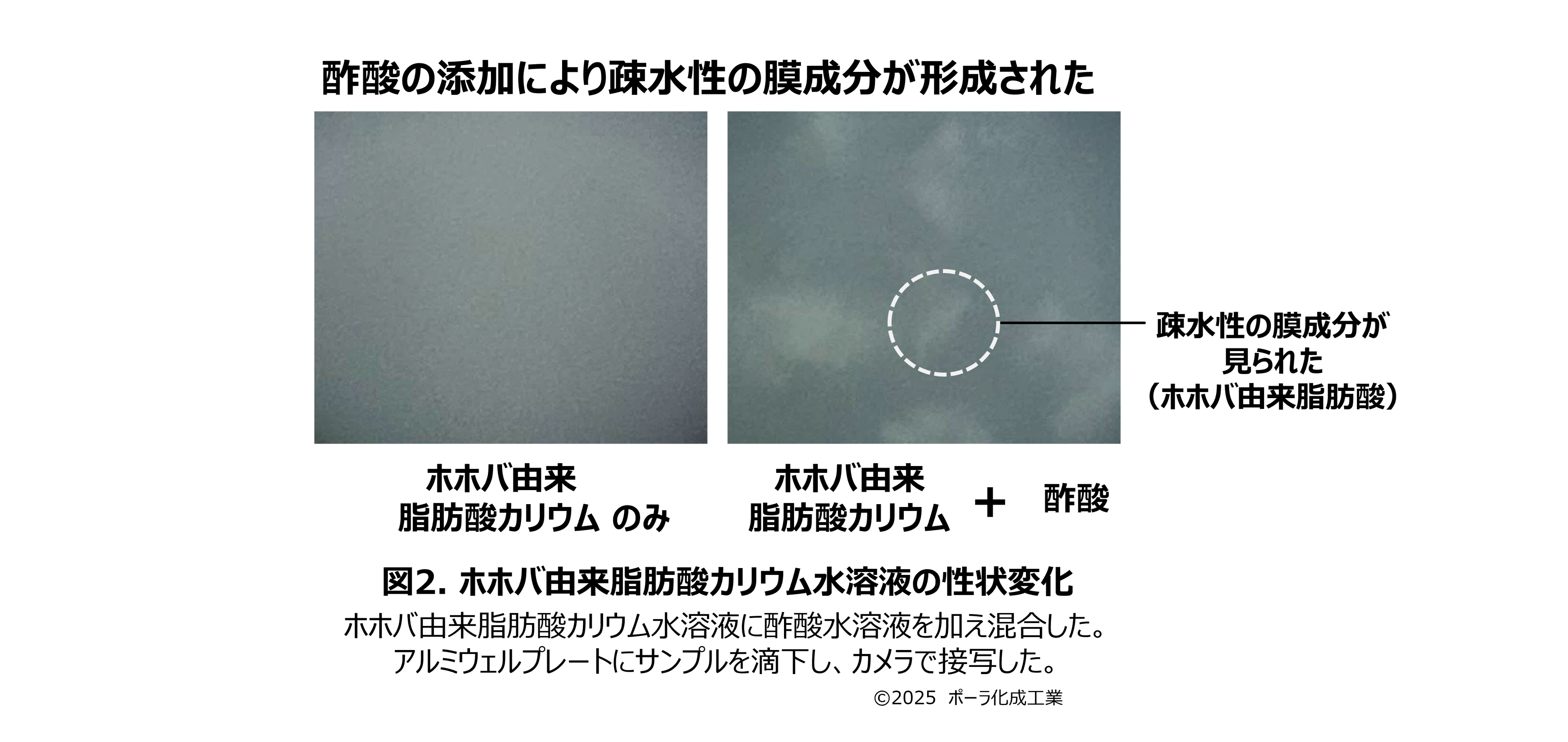 脂肪酸カリウムは、pHの変化によって水への溶けやすさが変わることが知られています。ここでは、UVを浴びた際に生じる酢酸によるpH変化により化粧膜表面に起こる反応を疑似的に確認する実験を行いました。
