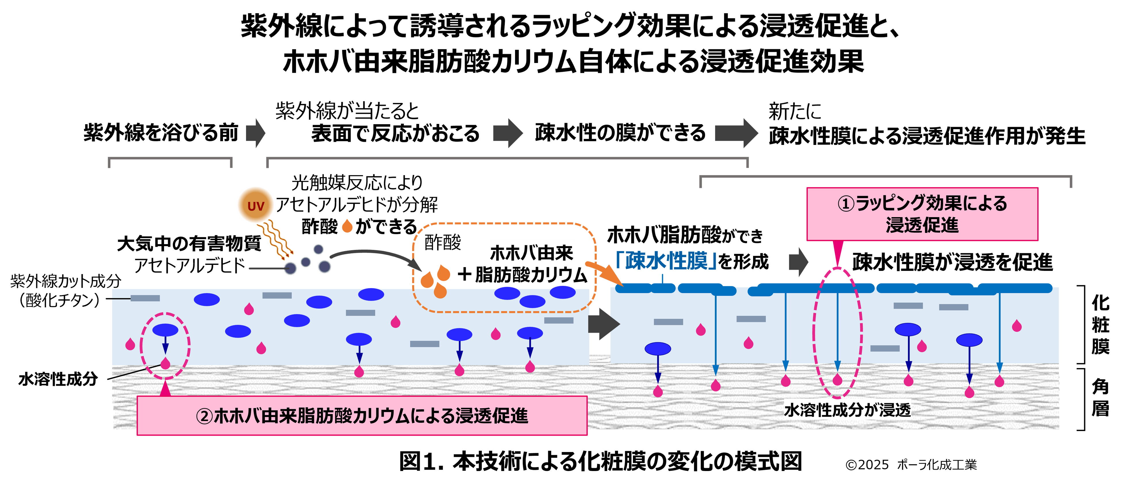 [画像1: https://prcdn.freetls.fastly.net/release_image/92303/165/92303-165-dd66e07ddce789da4866f5f530fe52d6-3900x1697.png?width=536&quality=85%2C75&format=jpeg&auto=webp&fit=bounds&bg-color=fff ]検証の結果、ホホバ由来脂肪酸カリウムを配合した製剤を開発し、その化粧膜に酢酸を滴下すると、膜を通る水分蒸散量が抑えられることが実際に確認されました(補足資料2)。この結果は、脂肪酸カリウムが脂肪酸に変化したことで膜の閉そく力が高まったことを示唆しています。閉そく力が増すと化粧品中の成分の浸透が促進される「ラッピング効果」が期待できます(図11.)。さらには、ホホバ由来脂肪酸カリウム自体にも浸透促進効果があることから(補足資料3、図12.)、室内でも、紫外線を浴びる屋外でも成分浸透が期待できると考えられます。また、水に強い疎水的な脂肪酸が日焼け止めの膜の表面を強化するので、紫外線からのディフェンス力を高めることが期待できます。