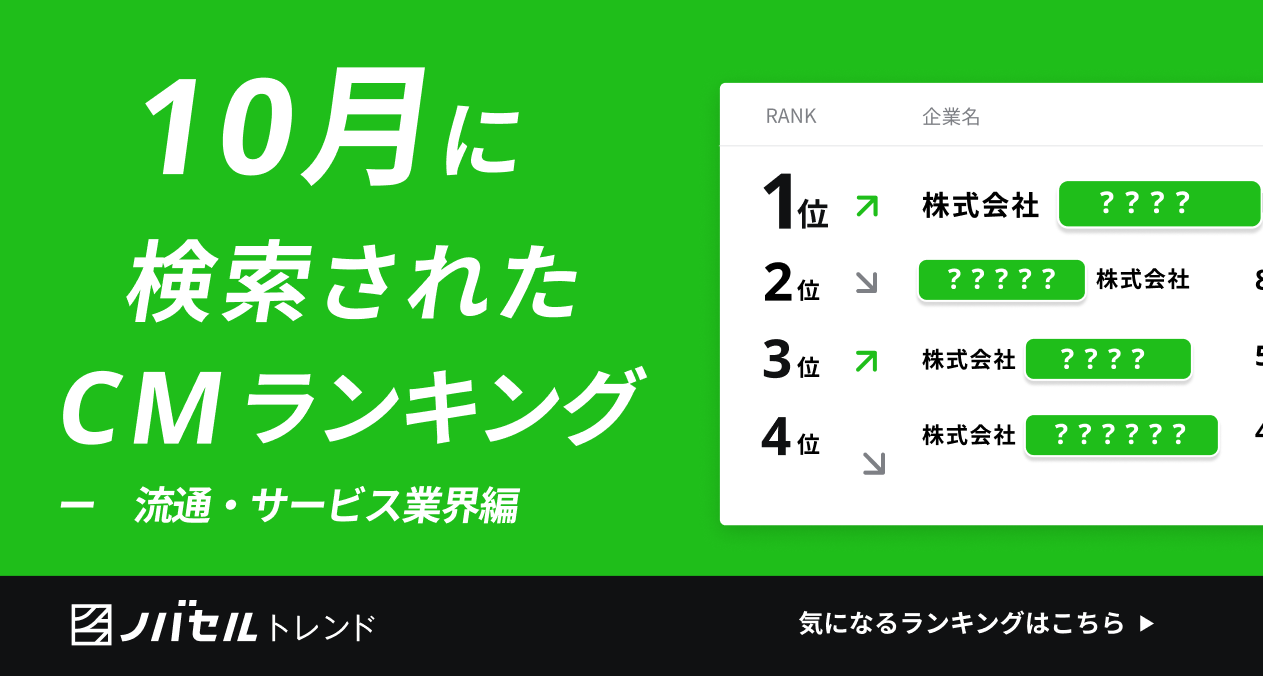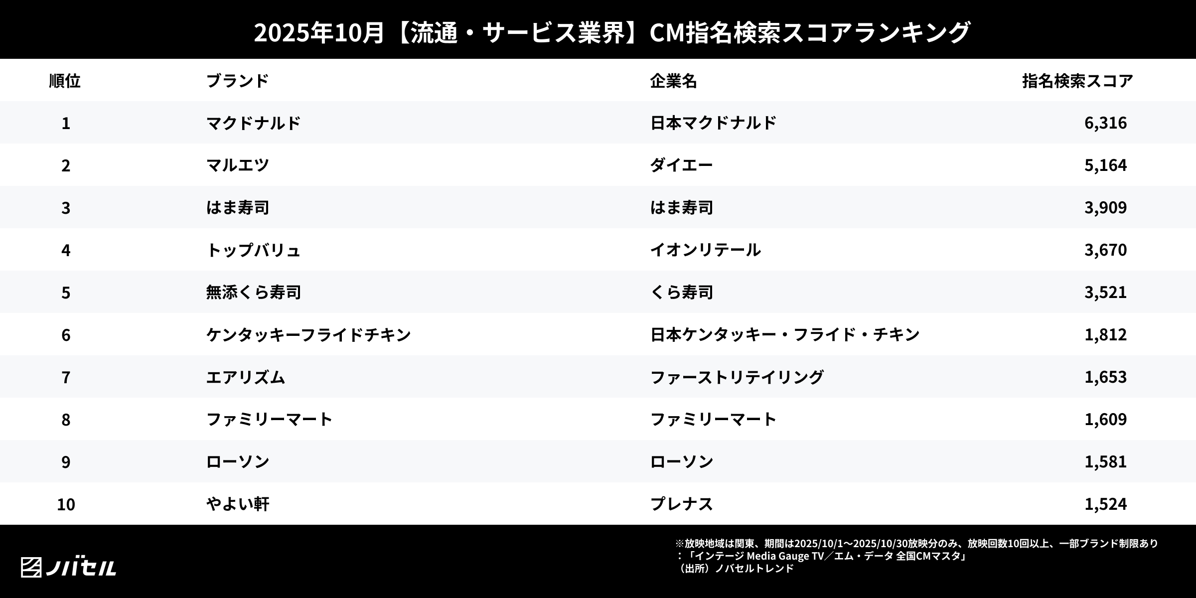 あらゆるテレビCMの指名検索スコアが可視化できる「ノバセルトレンド」を用いて、2025年10月の「流通・サービス業界(*¹)」における指名検索スコア順テレビCMランキングの上位10位をご紹介します。