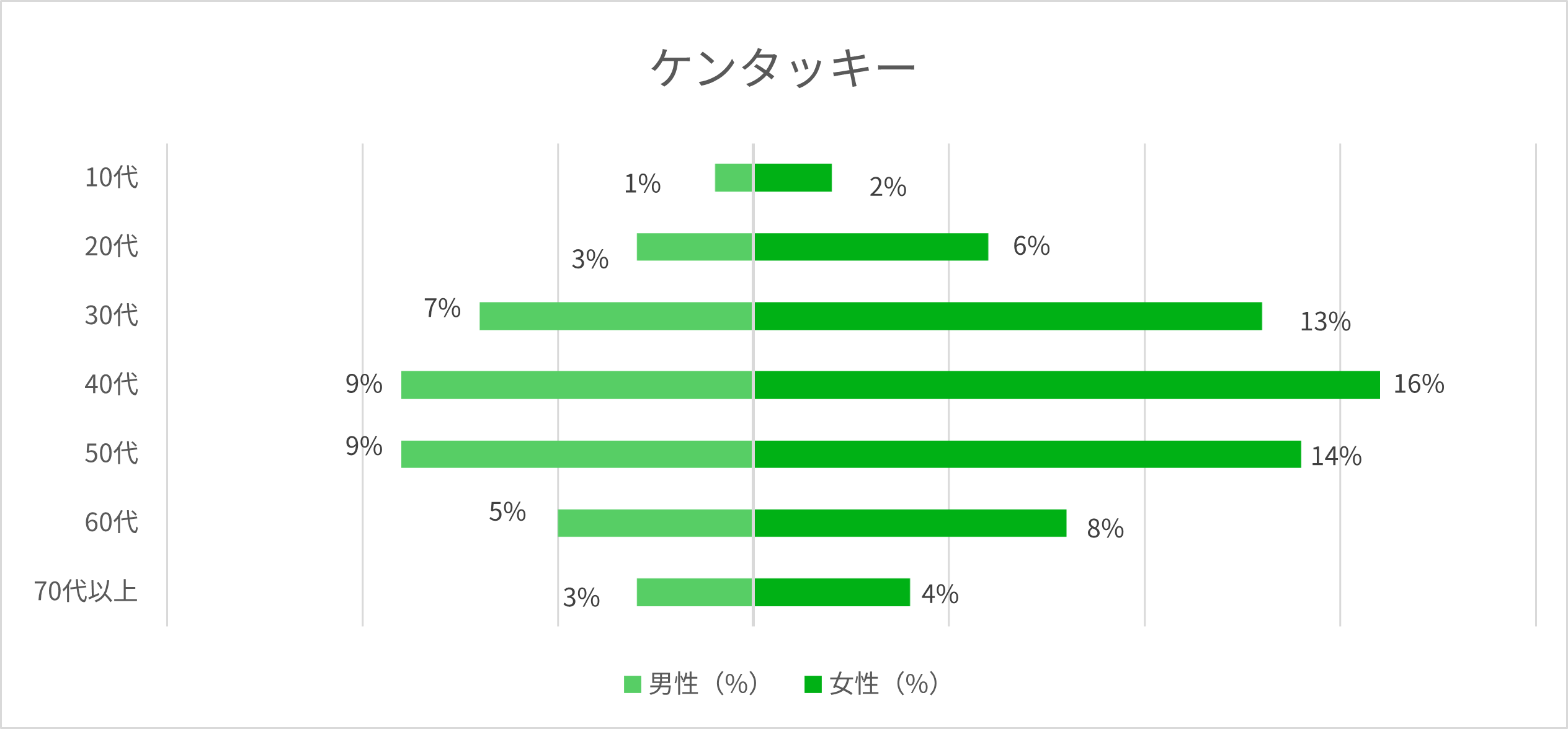 男女別の年代比では、「ケンタッキー クリスピー」「ケンタッキー」ともに40代女性の割合が最も高くなっています。その中で「ケンタッキー クリスピー」は、男女ともに20代の検索ボリュームが上昇すると同時に10代の割合も増加しています。このことから、「ケンタッキー」全般よりも若い年代による検索が多い傾向にあることがわかります。
