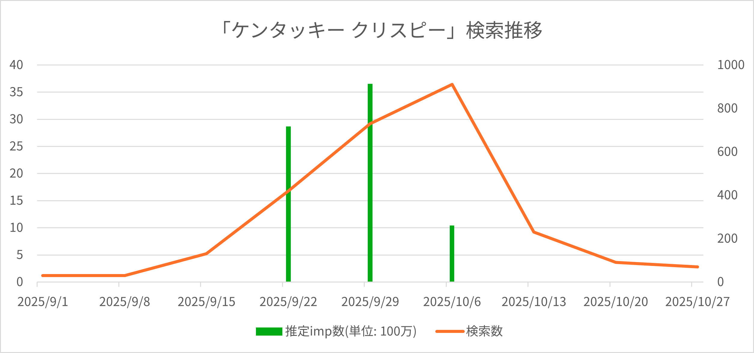 “食欲の秋”に贈る2週間限定の特別企画として、9月24日から10月7日まで実施された今回の「カーネルクリスピー1ピース半額」キャンペーン。9月24日に同キャンペーンのCM放映が始まると、「ケンタッキー クリスピー」の検索数が上昇し始めました。キャンペーン終了間際の10月6日の週に、検索数はピークに達しました。