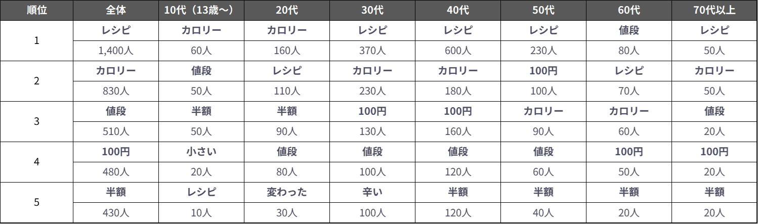 「ケンタッキー クリスピー」を検索した人の共起キーワードには、各年代とも主に「レシピ」や「カロリー」がトップに来ています。しかし、「値段」や「半額」といったキーワードも上位に挙がっています。中でも10代から20代では「半額」が3位となっており、若年層における注目の高さがうかがえます。また、過去に地域限定の「1ピース100円」キャンペーンが実施された背景からか、30代以上では「100円」というキーワードもトップ5以内に挙がっています。