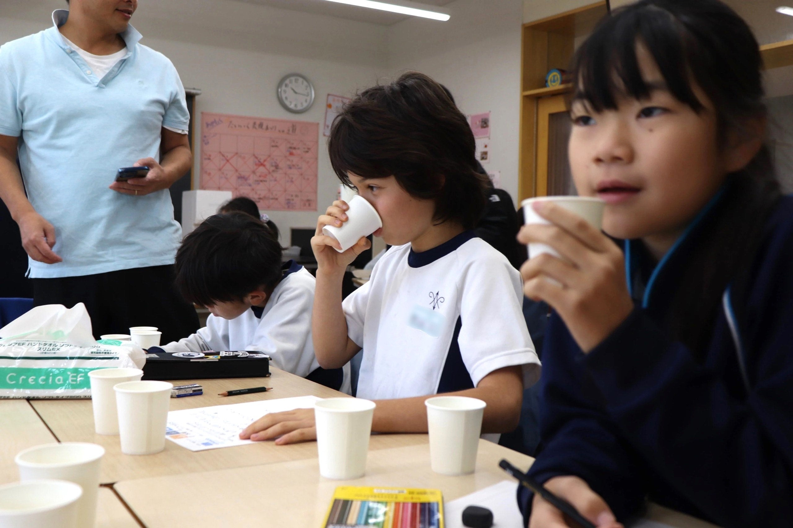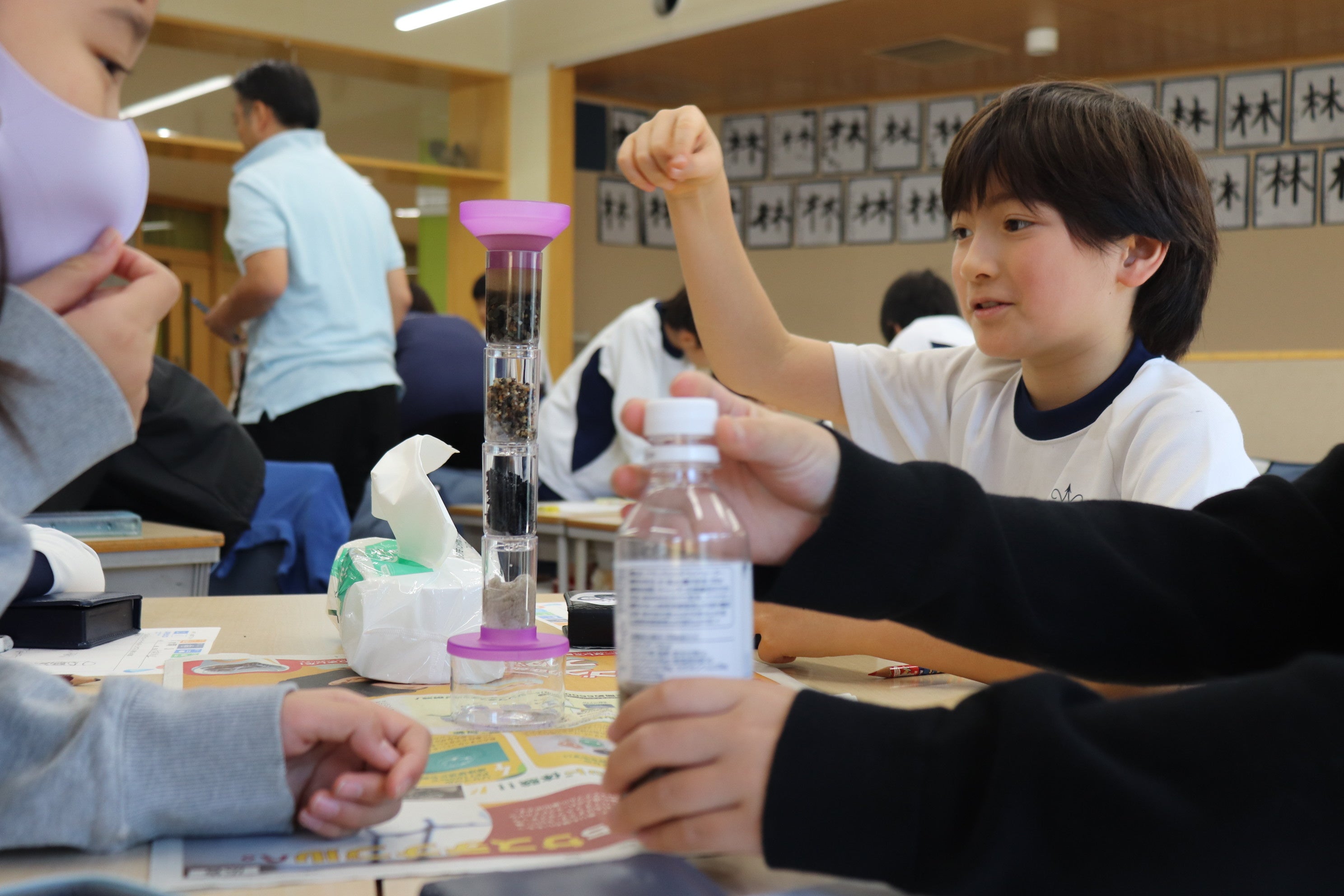私たちが生きていくうえで「水」はどれくらい重要な存在であるのか、そして普段使っている水道水や天然水といった「水」はどこで生まれ、どのようにしてみなさんのお家まで届いているのかをクイズや動画等を交えながら楽しく授業をおこないました。特別出張授業を通して、子どもたちに「水」や「自然」を守るために自分たちにできることは何かを自由な発想で考えていただきました。授業では、「水」や「自然」に対する理解をさらに深めることができるよう、ろ過実験をおこない、自然の大切さを学んでいただきました。
