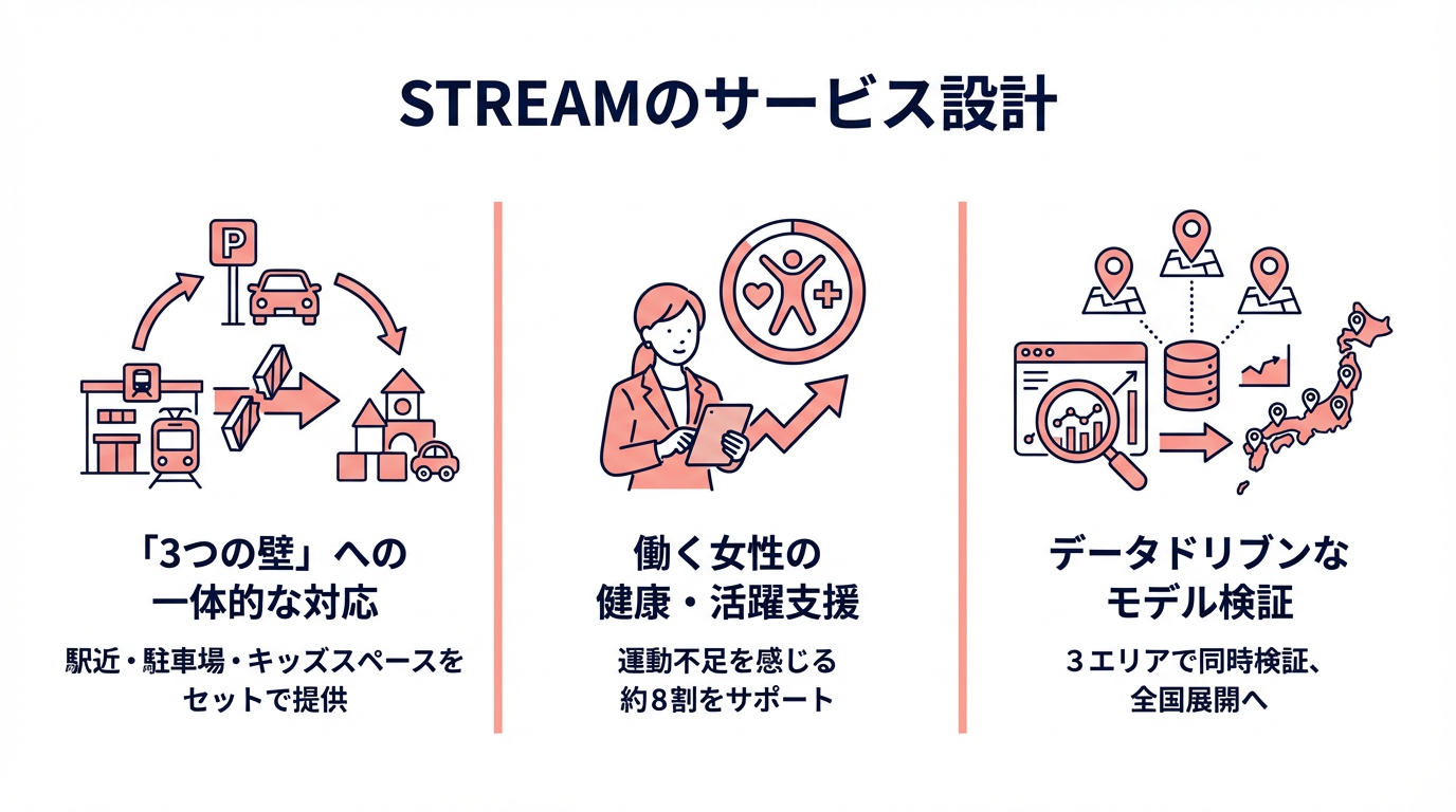 「駅近」「駐車場」「キッズスペース」をセットで提供することで、都心部の高水準なサービスを郊外の利便性に載せかえ、運動を諦めていた人々が直面していた物理的・育児上のハードルをまとめて下げます。