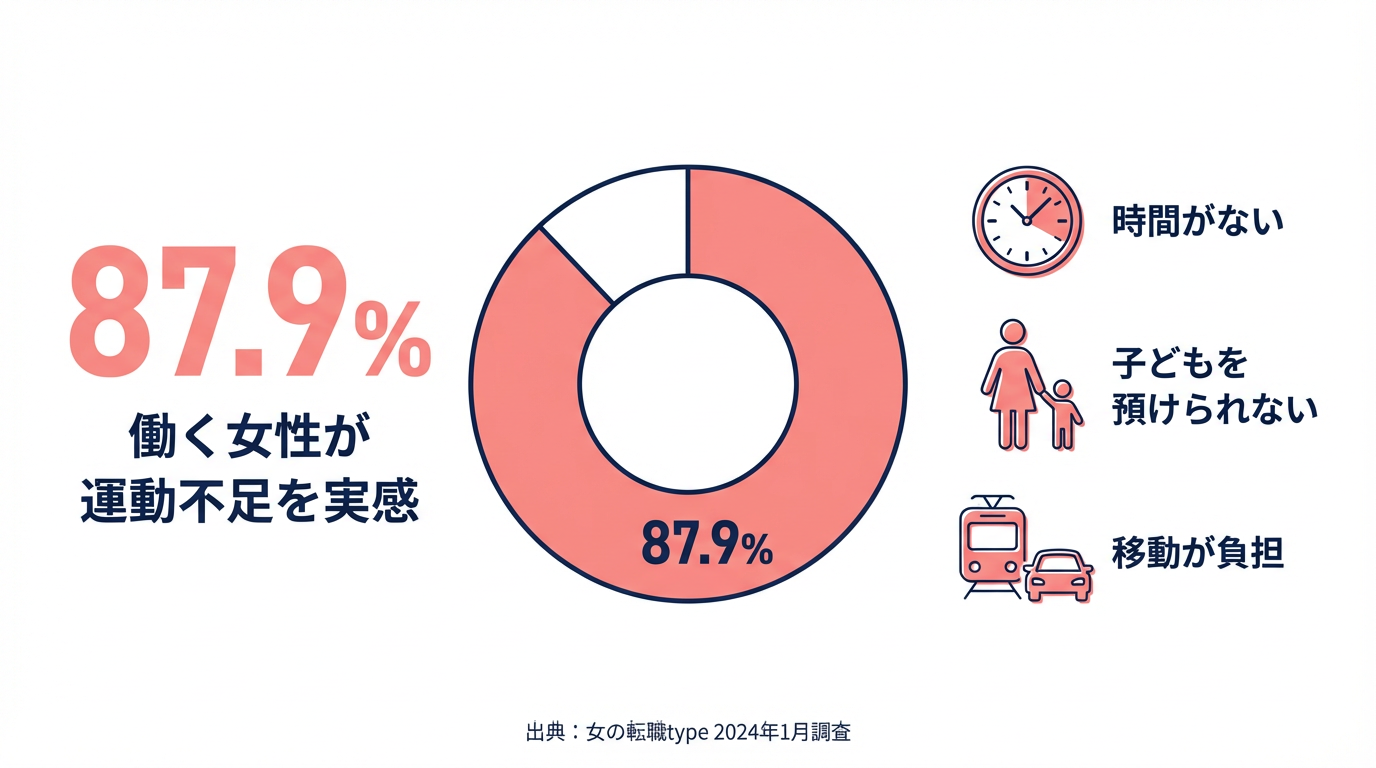 近年、働き盛りの中高年、とくに働く女性の運動不足が深刻化しています。「女の転職type」が2024年1月に実施したアンケート調査「【アンケート調査】運動してる?」では、働く女性の約8割(87.9%)が自分を「運動不足だと感じている」と回答しています(※注1)。とくに共働き・子育て世代では、「時間がない」「子どもを預けられない」「移動が負担」といった理由から、運動や健康への投資が後回しになりがちです。