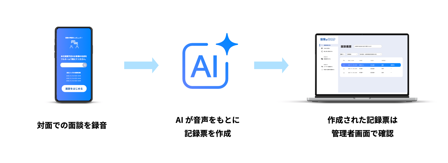 専用アプリで面談を録音するだけで意向把握・比較推奨販売記録や面談記録を自動作成し、管理者画面での確認・承認までオンラインで完結できるようにすることで、書類作成・共有・管理を自動化し、記録業務の負担軽減とコンプライアンス対応を同時に実現します。