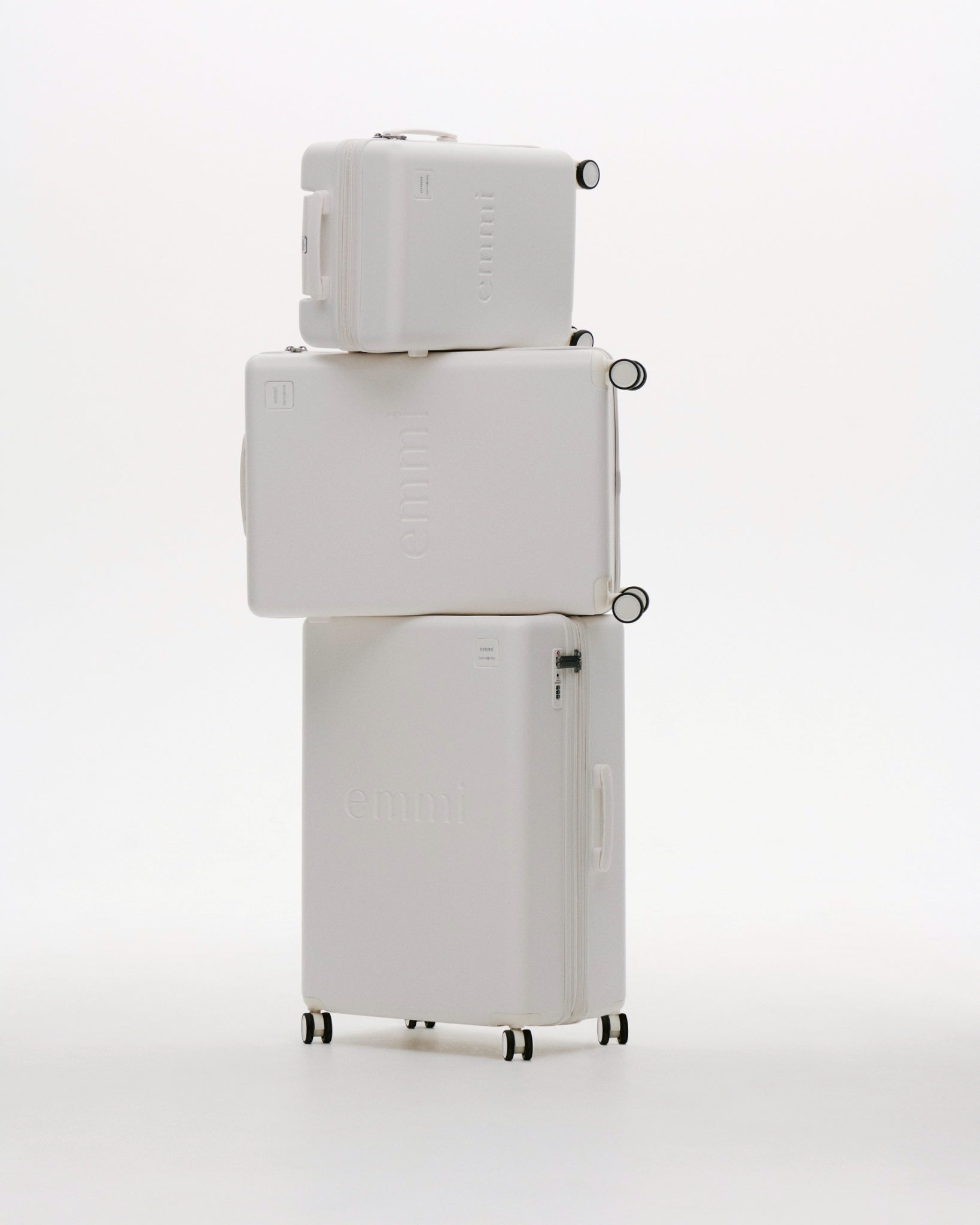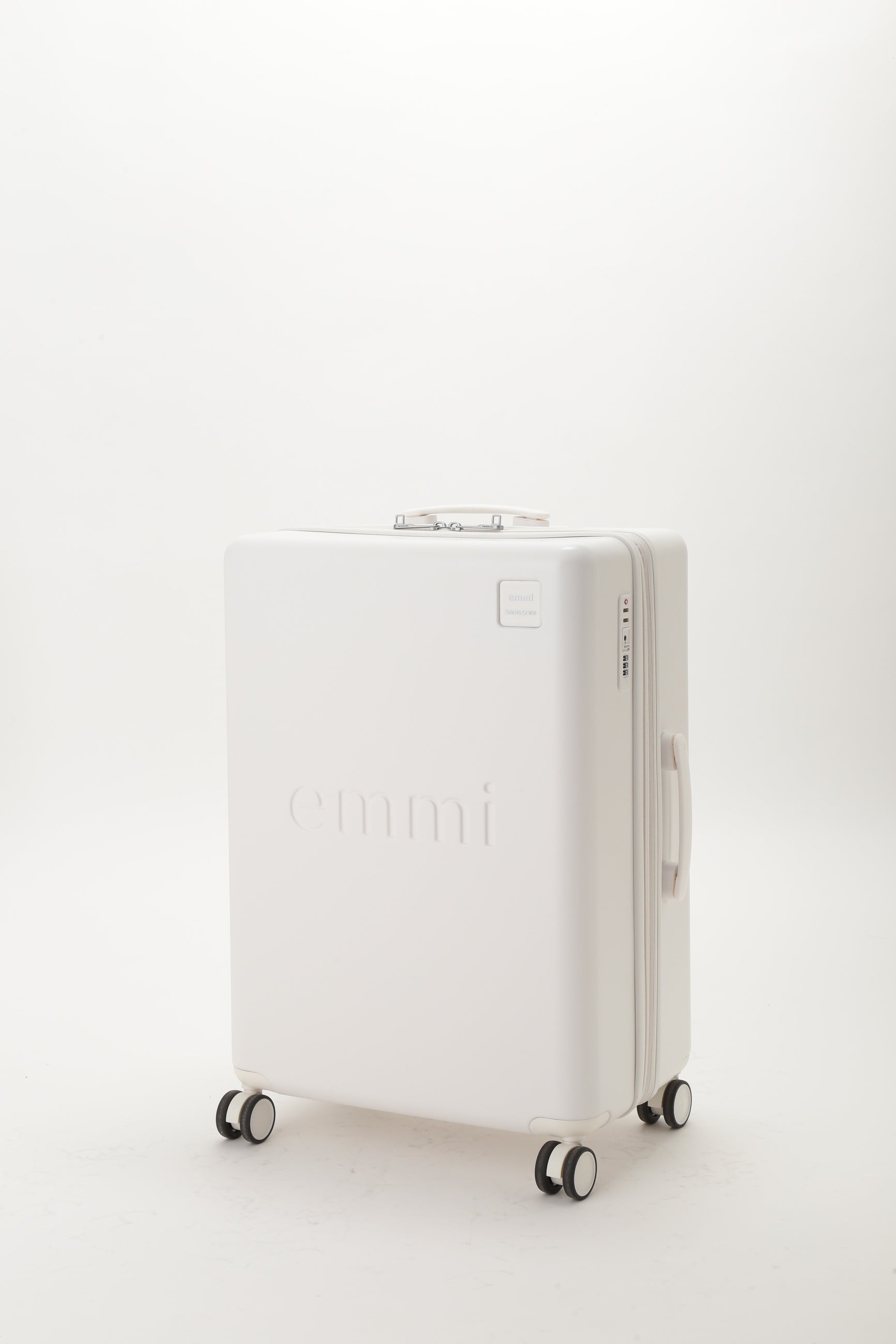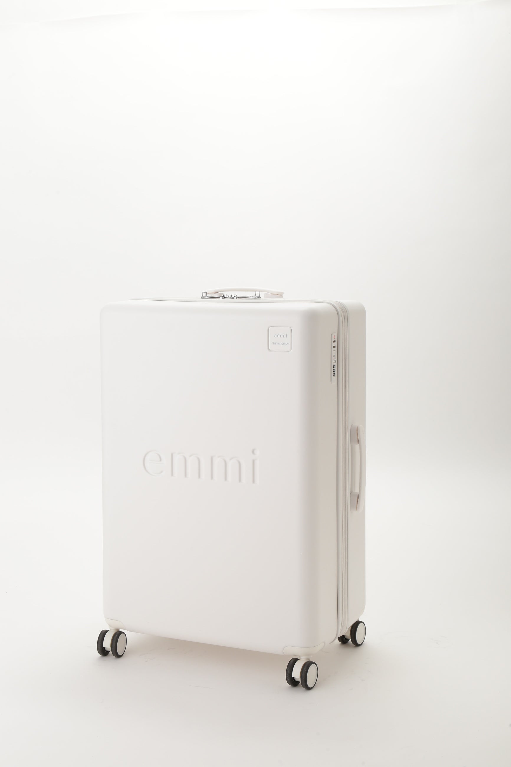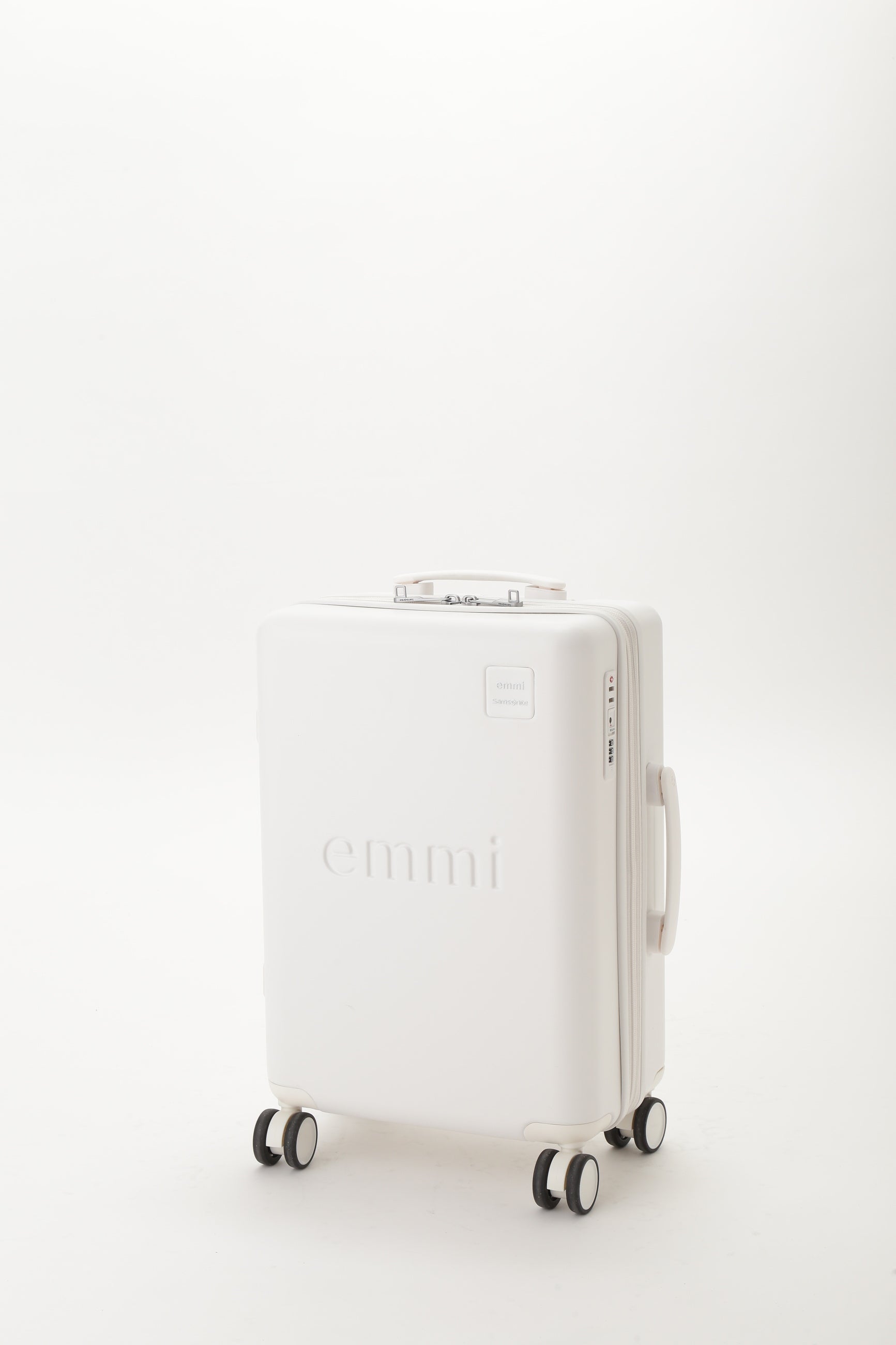 emmiとサムソナイトのスペシャルコラボレーション。emmiのブランドコンセプトである"クリアモード"を表現するような、極限までマットな質感にこだわりぬいたマットホワイトの洗練されたミニマルな外観が特徴なシェルボディ。シェル部分は、使用済みPETボトルからつくられたリサイクルポリカーボネートを50%以上使用しています。フロントには立体的なemmiロゴ、emmi×Samsoniteのダブルネームロゴのプレートがデザインされています。旅のストレスを軽減する、考え抜かれた機能とアクセサリーが満載です。