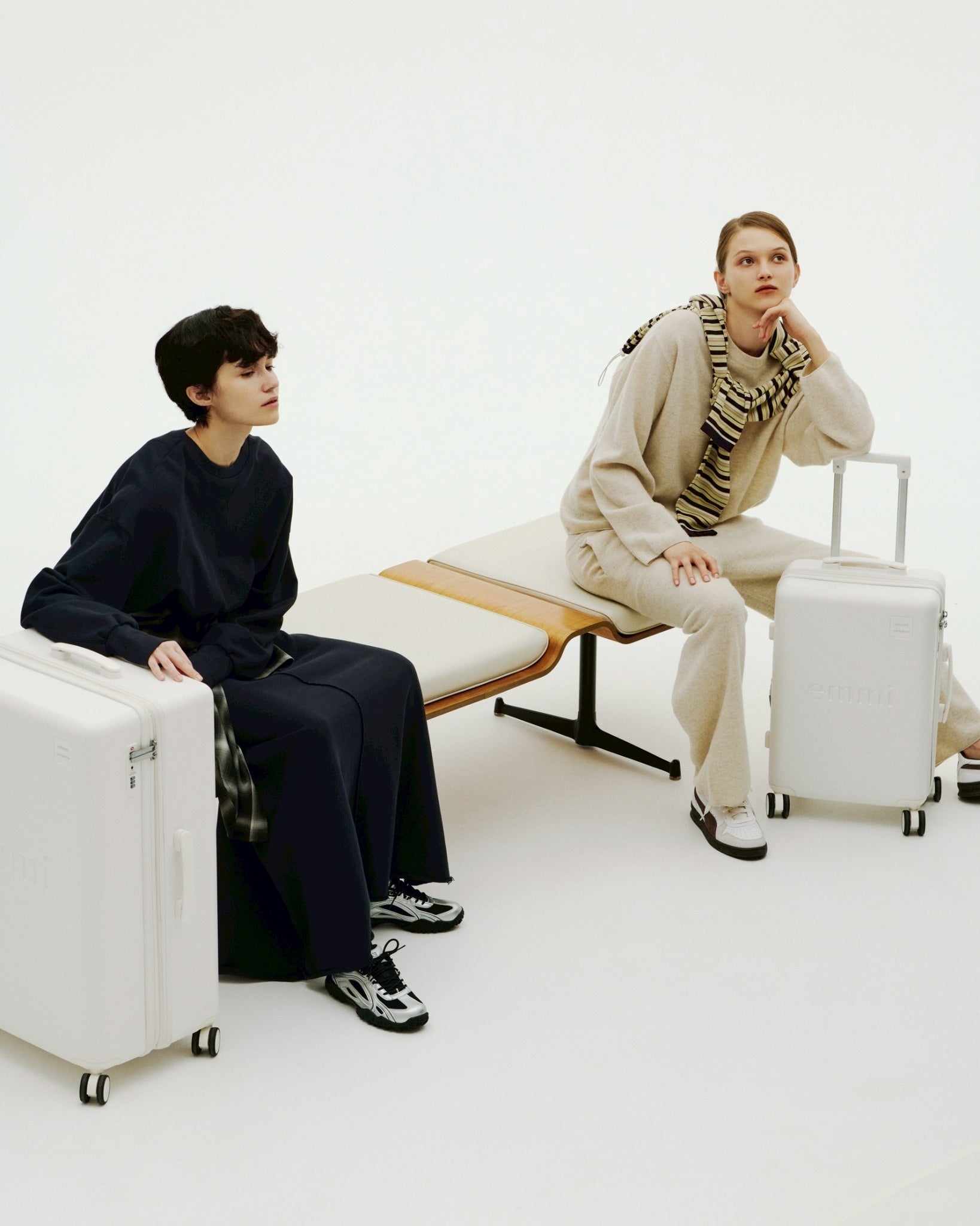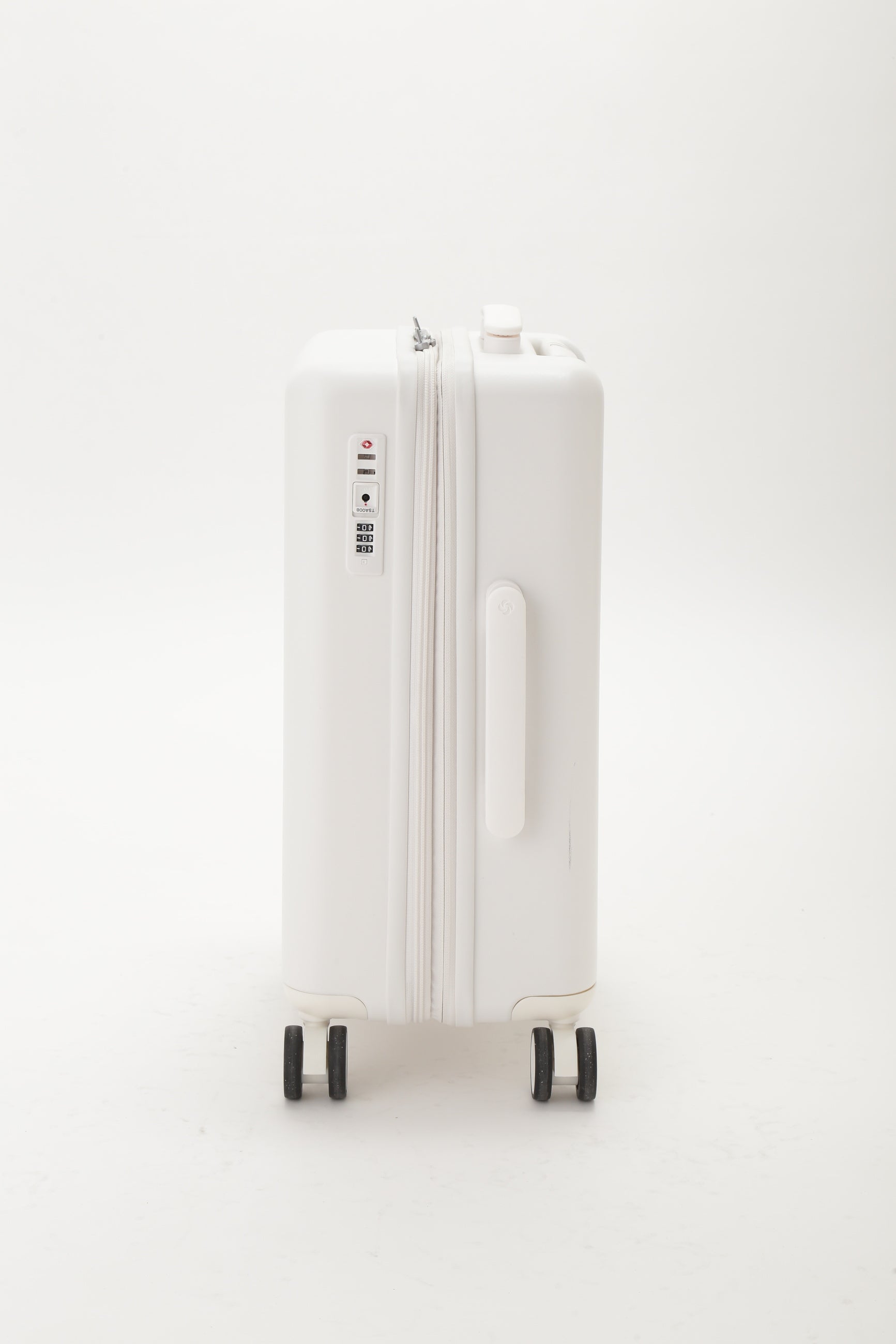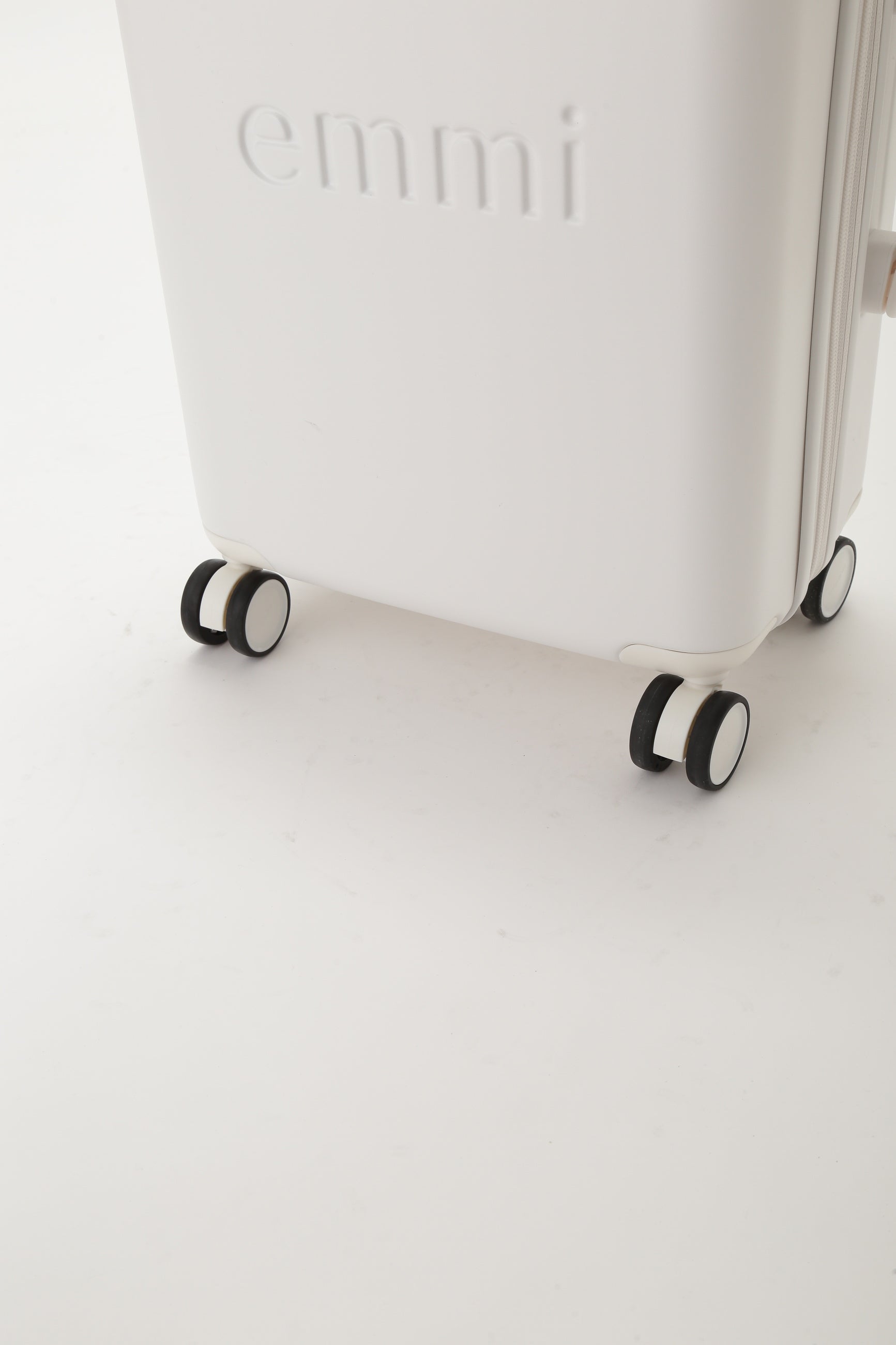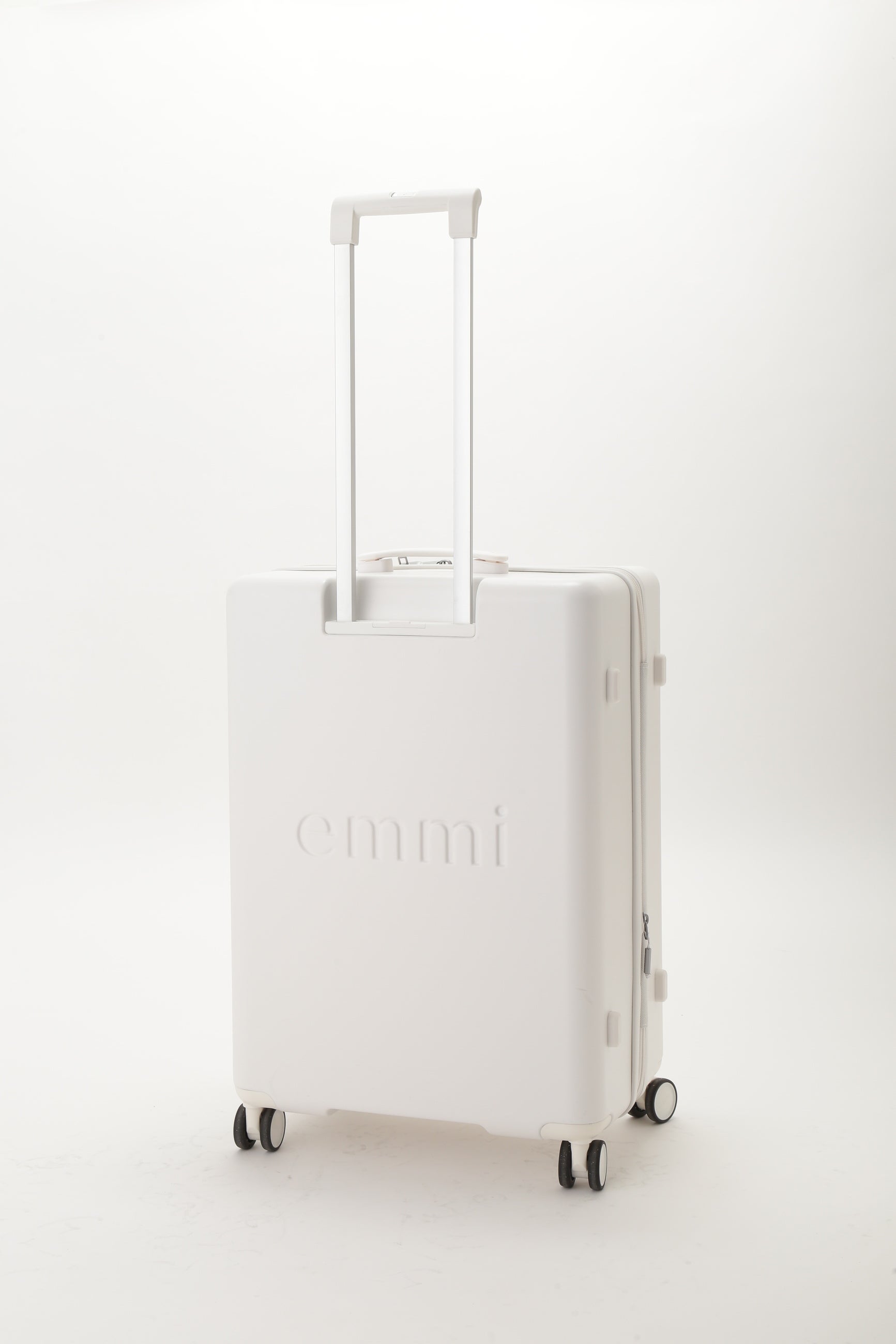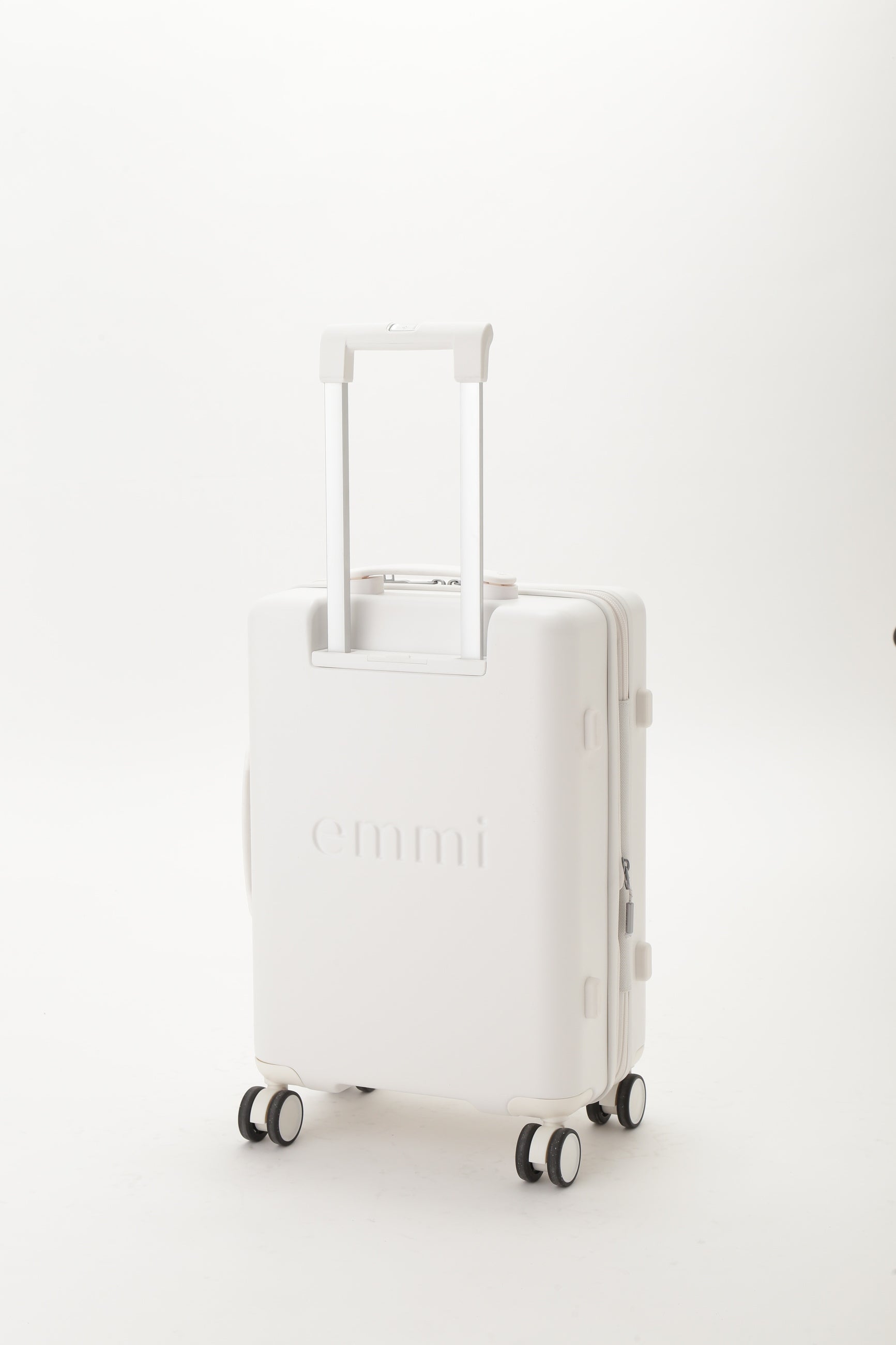 emmiとサムソナイトのスペシャルコラボレーション。emmiのブランドコンセプトである"クリアモード"を表現するような、極限までマットな質感にこだわりぬいたマットホワイトの洗練されたミニマルな外観が特徴なシェルボディ。シェル部分は、使用済みPETボトルからつくられたリサイクルポリカーボネートを50%以上使用しています。フロントには立体的なemmiロゴ、emmi×Samsoniteのダブルネームロゴのプレートがデザインされています。旅のストレスを軽減する、考え抜かれた機能とアクセサリーが満載です。