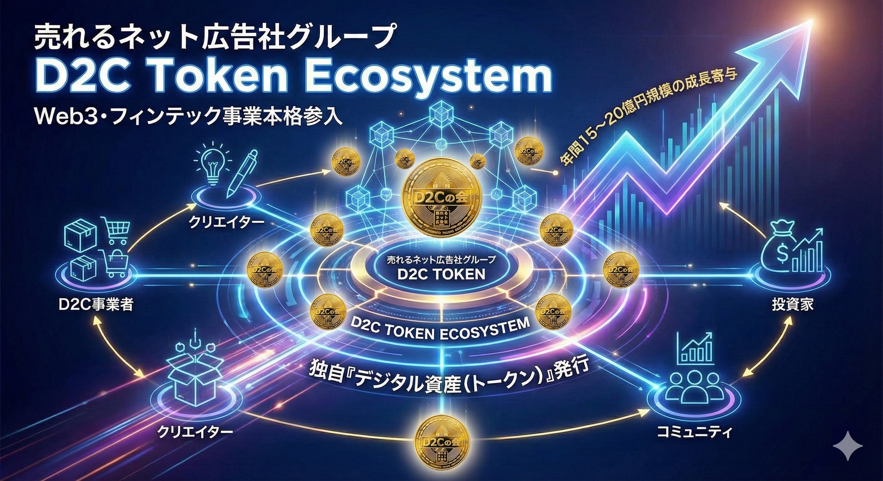 売れるネット広告社グループ株式会社(本社:福岡県福岡市、代表取締役社長CEO:加藤公一レオ、東証グロース市場:証券コード9235、以下 売れるネット広告社グループ)は、ブロックチェーン技術を活用したWeb3プラットフォーム「FiNANCiE(フィナンシェ)」において、当社独自のデジタル資産(トークン)を発行し、D2C産業に特化した新たな金融・産業インフラ「D2Cトークンエコシステム」を構築することを決定いたしましたので、お知らせいたします。