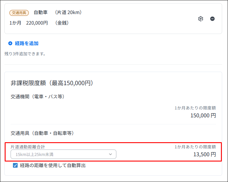 給与計算における通勤手当の非課税計算についても、改正後の非課税限度額に既に対応しています。従業員の通勤経路に交通用具と片道距離を設定していると、片道距離と改正後の非課税限度額に沿って自動計算されるので、お客さまで通勤手当の非課税計算を行う必要はありません。