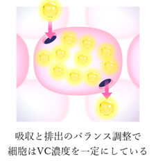 しかしながら、皮膚内に送り届けられたVCは必ずしも細胞に活用されるわけではありません。細胞が実際に細胞外から細胞内に取り込んで蓄えるVC量は、細胞外のVC濃度と完全に相関はせず、ある程度細胞外VCが高濃度になると細胞内VCの増加は頭打ちになる事がわかっていました(図2)。これは、細胞がVCの吸収と排出、酸化還元反応のバランスを制御し、細胞内のVC濃度を一定に保つ性質によるものであり、過剰なVCは細胞に入れず排出されてしまうと考えられます(図3)。
